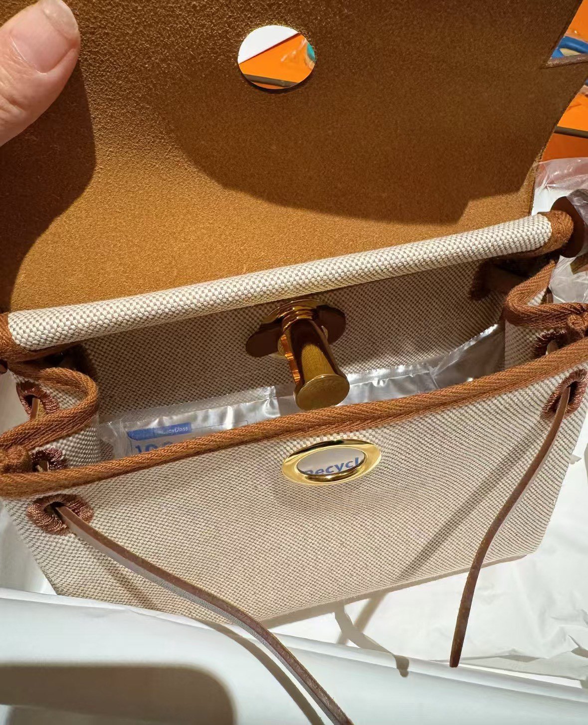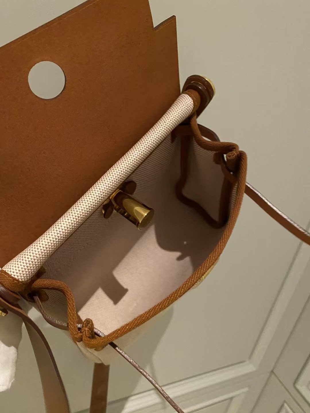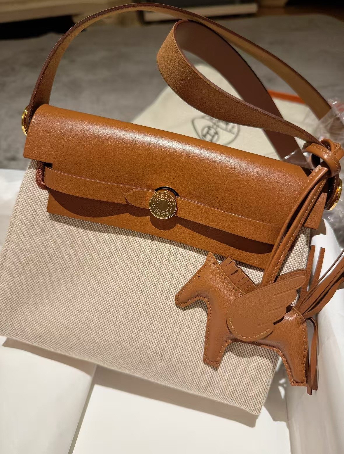 Product Parameters: Color: Classic Gold/Tan Leather with Beige (Ecru) Canvas; Dimensions: Mini Size 20 x 17 x 7 cm; Materials: Premium Imported Calfskin and High-Density Waterproof “Toile” Canvas; Hardware: Polished Gold-Finish Steel Hardware with Logo Engraving; Accessories: Dust bag, care manual, and original-style packaging.
