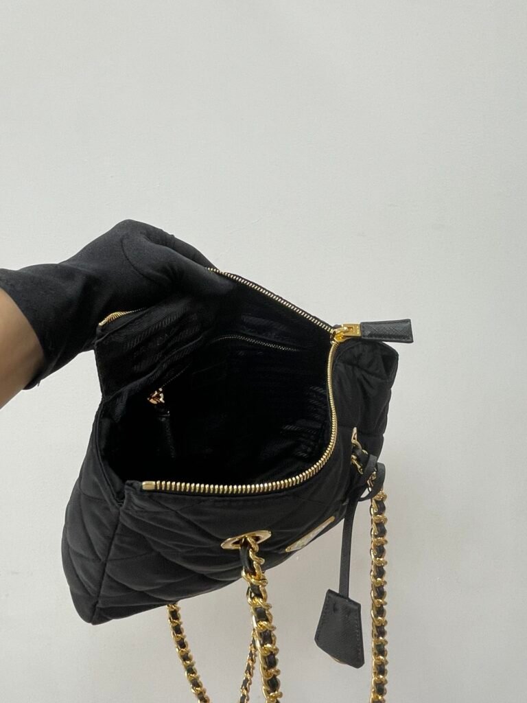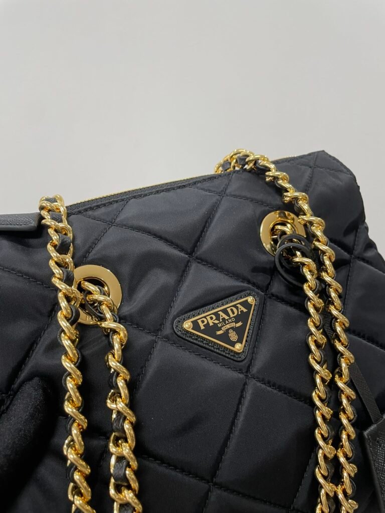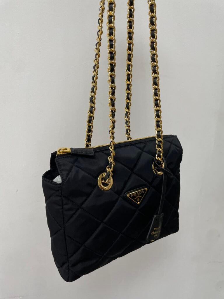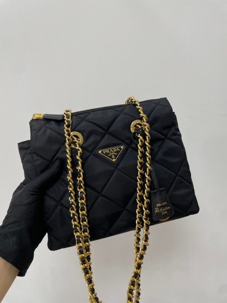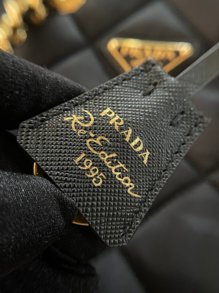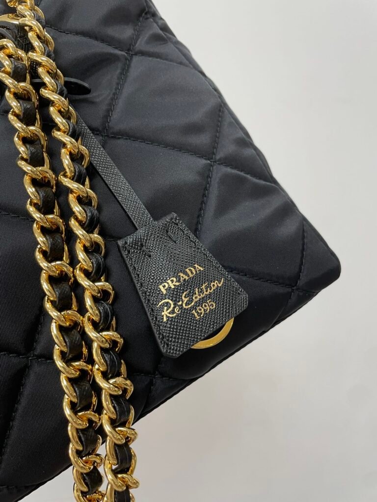 Product Parameters: Brand: Prada (High-end Replica); Model: Re-Edition 1995 Quilted Double Chain Bag; Color: Classic Black (Nero) with Gold-tone Hardware; Material: Premium Imported Re-Nylon, Saffiano Leather Trim; Dimensions: 25 x 19 x 7 cm; Accessories: Integrated Metal Chain Straps, Removable Leather Keychain/Tag, Dust Bag.