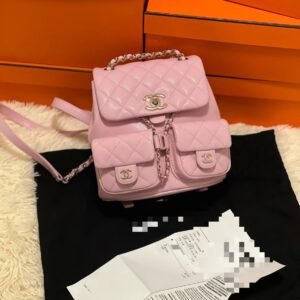 Chanel Light Pink Quilted Leather Mini Backpack with Front Pockets & Gold Hardware 17.5×16.5x10cm