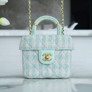 Chanel 23S Mini Top Handle Vanity Case 15cm Mint Green & White Tweed Box Bag with Gold-Tone Hardware