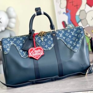 - Key Features: “Monogram Drip” wave design, red heart-shaped luggage tag, adjustable/removable shoulder strap, top handles, cabin-friendly size