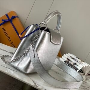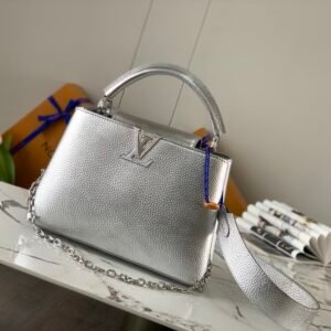 Louis Vuitton Capucines BB 26.5cm Handle Bag Silver Metallic Taurillon Leather with Monogram Flower Chain