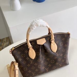 - Materials: Monogram coated canvas body, natural cowhide leather trim, and a microfiber lining