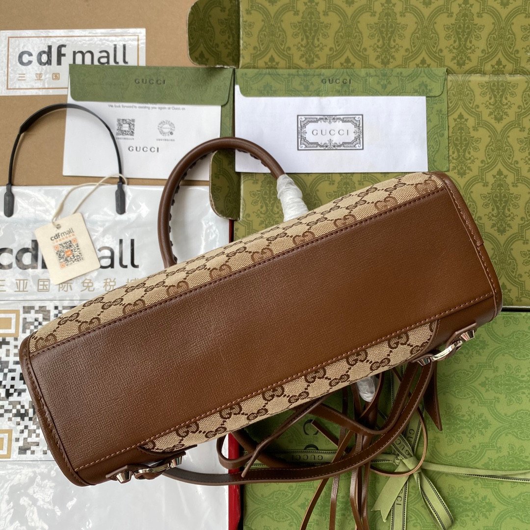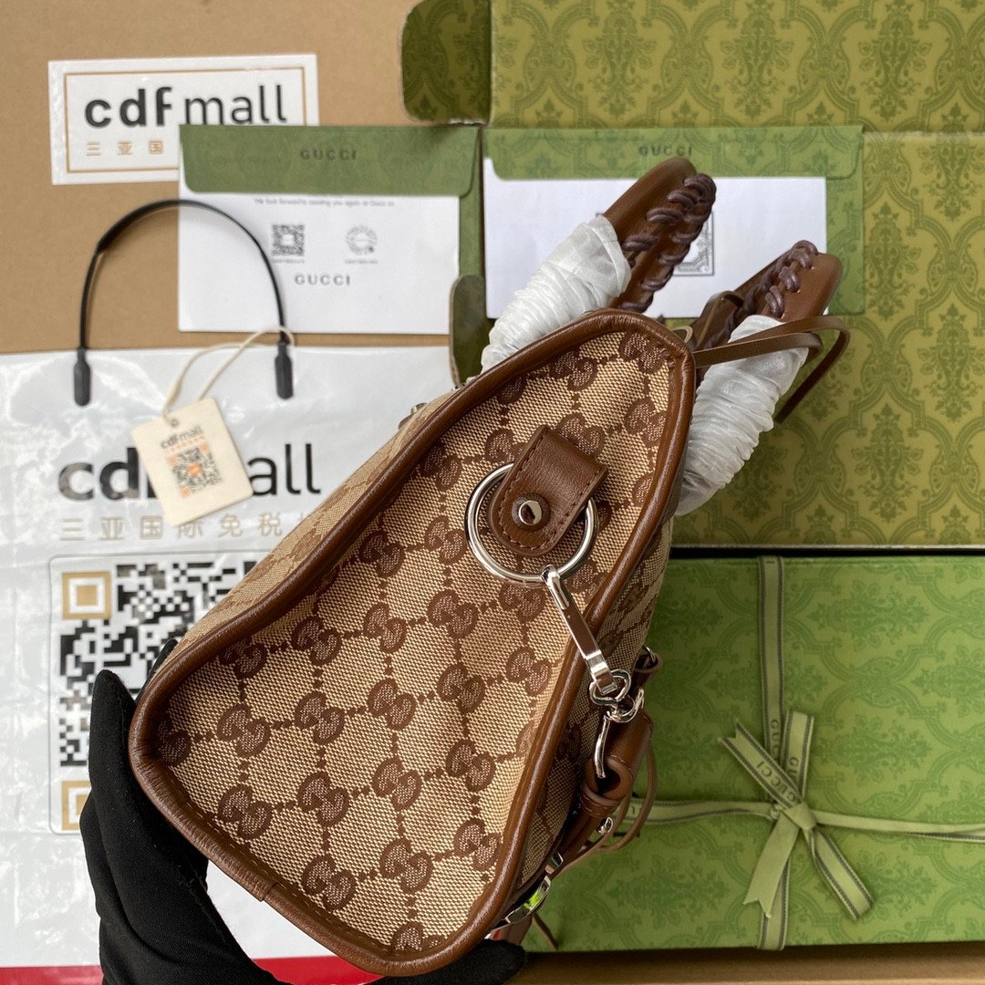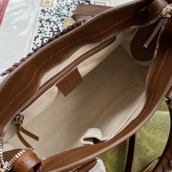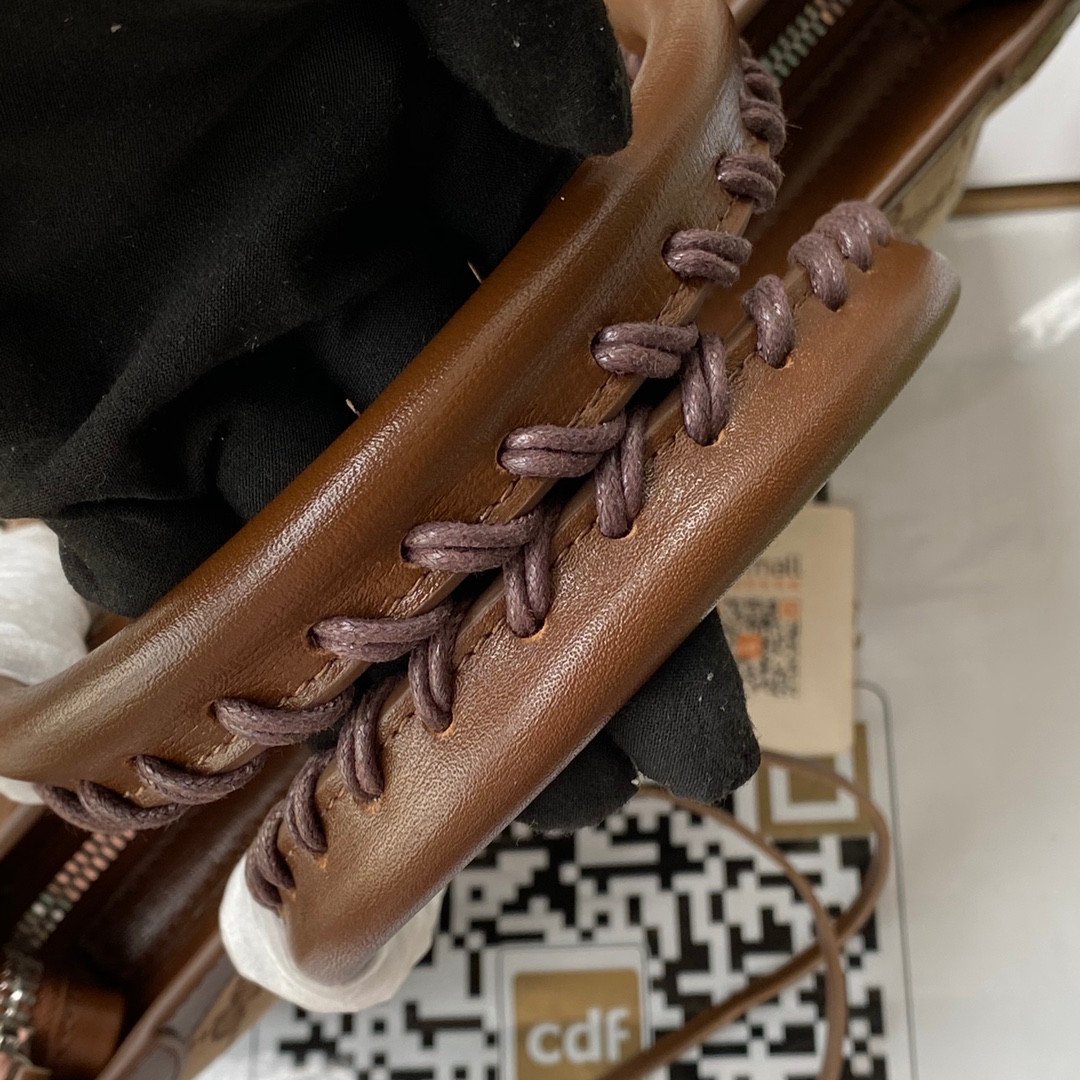 Iconic Details & Craftsmanship The structured canvas body is beautifully framed by rich brown leather trim. It features all the signature Neo Classic details, including striking metallic studs, decorative buckles, a functional front zip pocket, and the distinctive braided leather top handles.