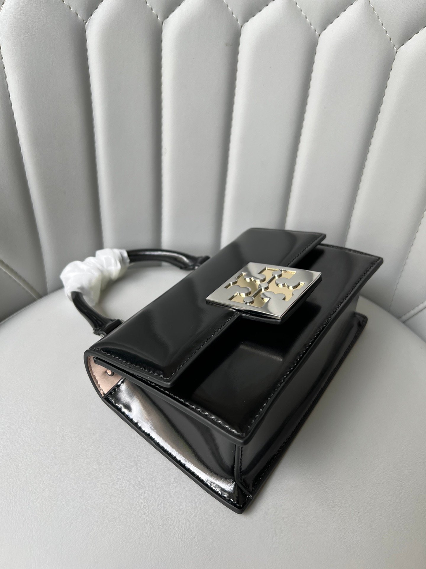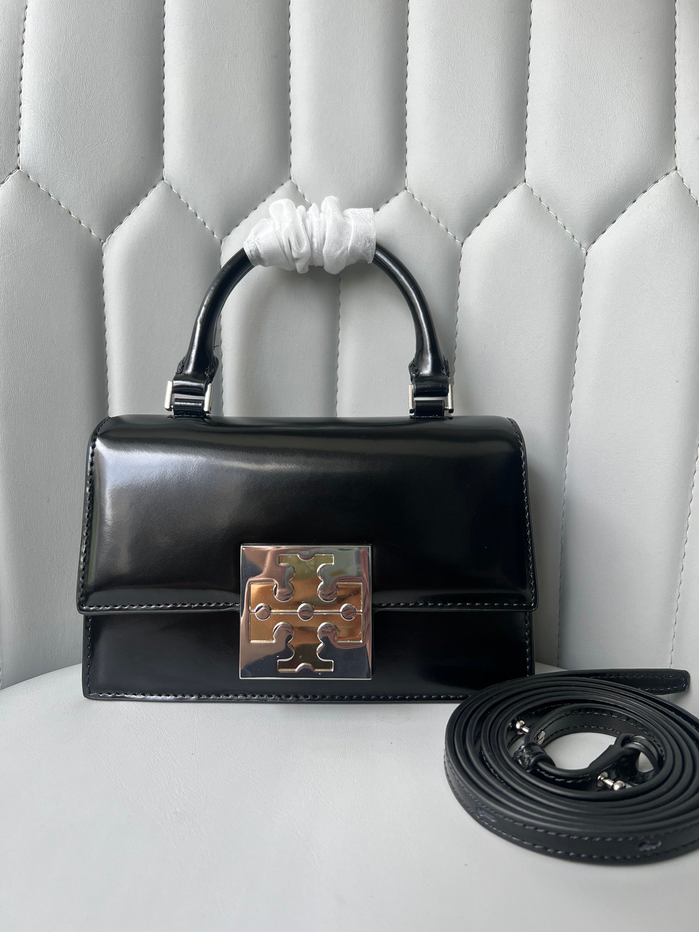 Product Description: The Bon Bon Mini is a delightful “candy-colored” addition to the Tory Burch collection, designed to offer the “instant gratification of something small and sweet.” Crafted from glossy Spazzolato leather, this bag features a structured, petite silhouette that maintains its shape beautifully.