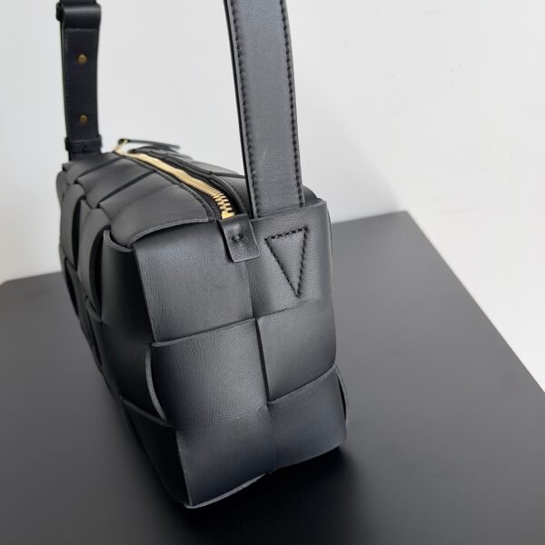 Crafted with Bottega Veneta’s signature Intrecciato weave, this bag features a structured yet soft rectangular body that fits perfectly under the arm. It is described as “super versatile,” making it an ideal companion for elevating diverse outfits. The bag features an adjustable strap with a distinctive triangular buckle, allowing for a customized fit, and is secured with a top zip closure for practicality.