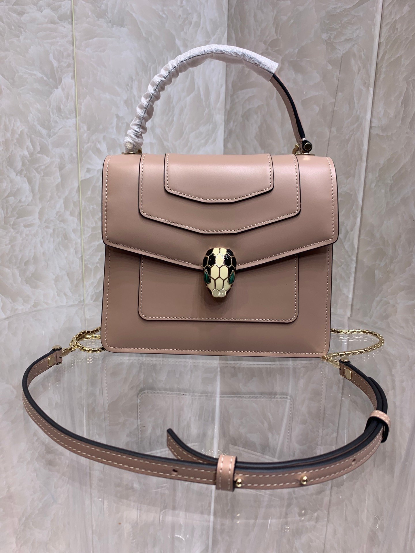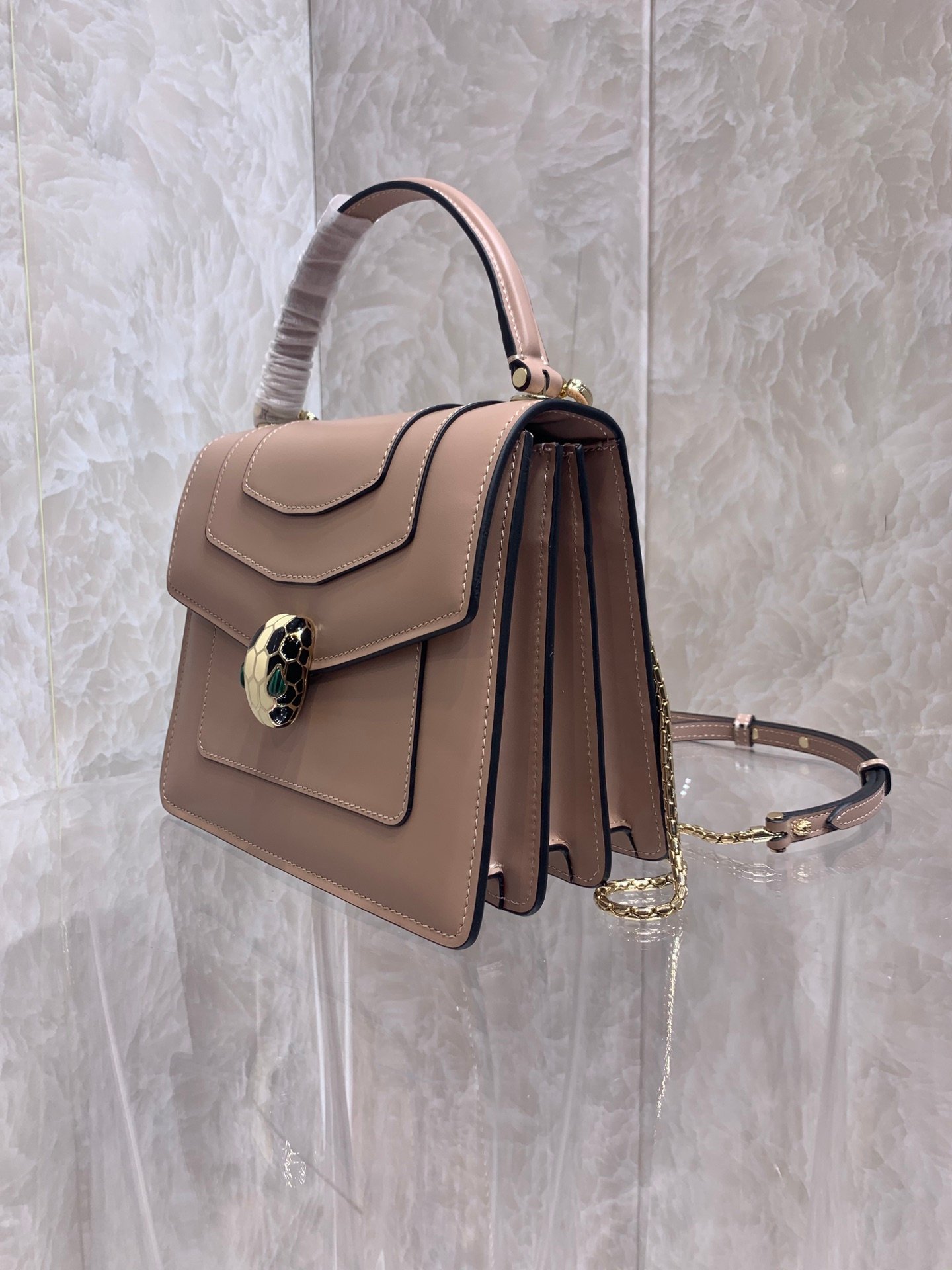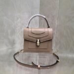 The Jeweler’s Bag Elevate your accessory collection with the Bvlgari Serpenti Forever Top Handle Bag. Blending contemporary style with Roman heritage, this bag is a true jewel of leather goods. The structured silhouette is crowned by the iconic snakehead closure, where scales of black and white enamel frame piercing green malachite eyes, acting as a hypnotic focal point.
