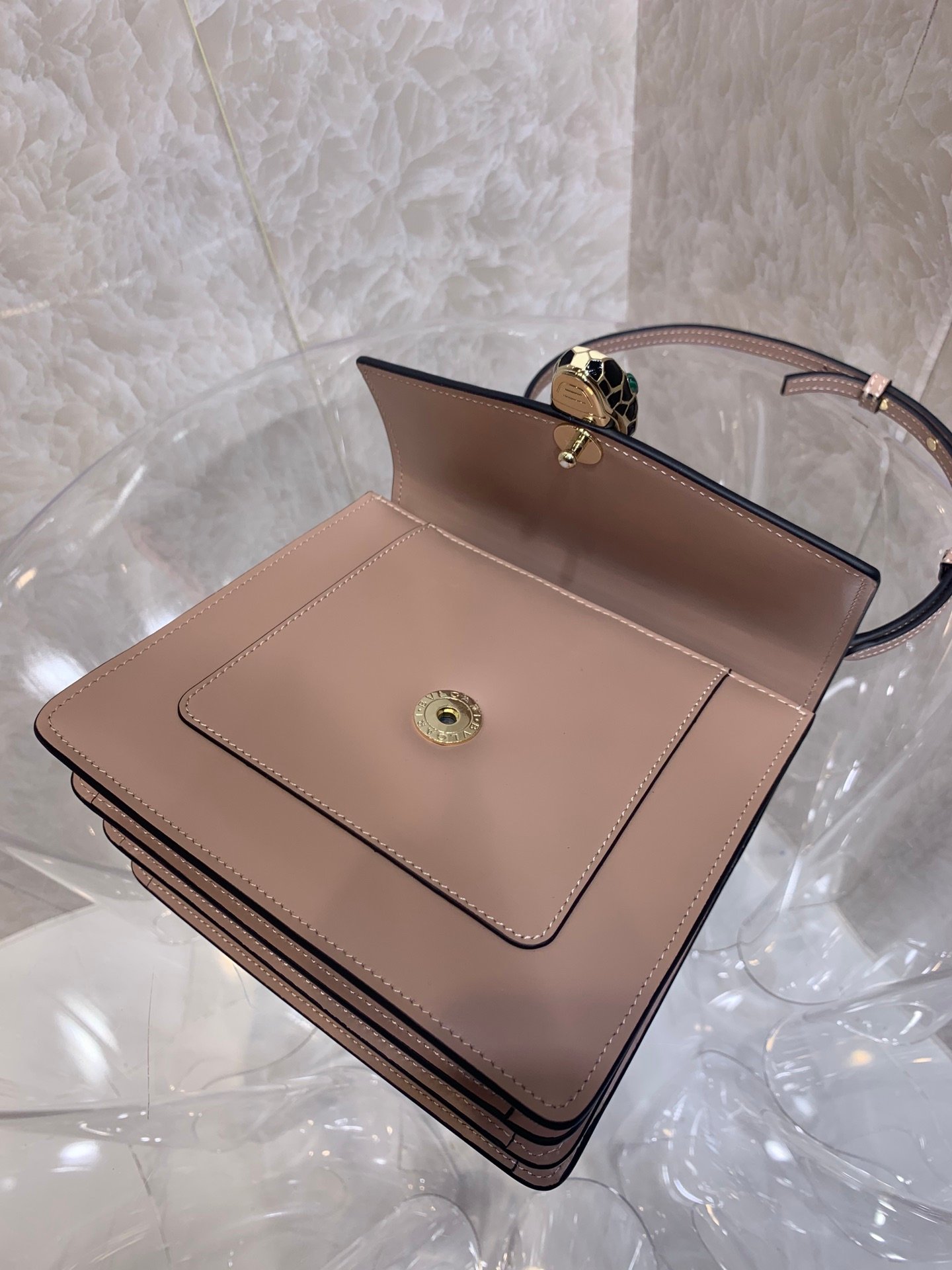 Iconic Closure: Features the signature Serpenti snakehead closure in gold-plated brass, embellished with black and white enamel scales and hypnotic green malachite eyes.