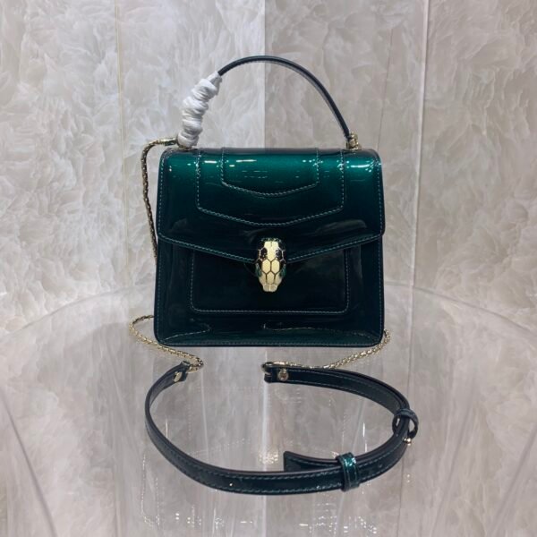 The Jeweler’s Bag Elevate your accessory collection with the Bvlgari Serpenti Forever Top Handle Bag. Blending contemporary style with Roman heritage, this bag is a true jewel of leather goods. The structured silhouette is crowned by the iconic snakehead closure, where scales of black and white enamel frame piercing green malachite eyes, acting as a hypnotic focal point.