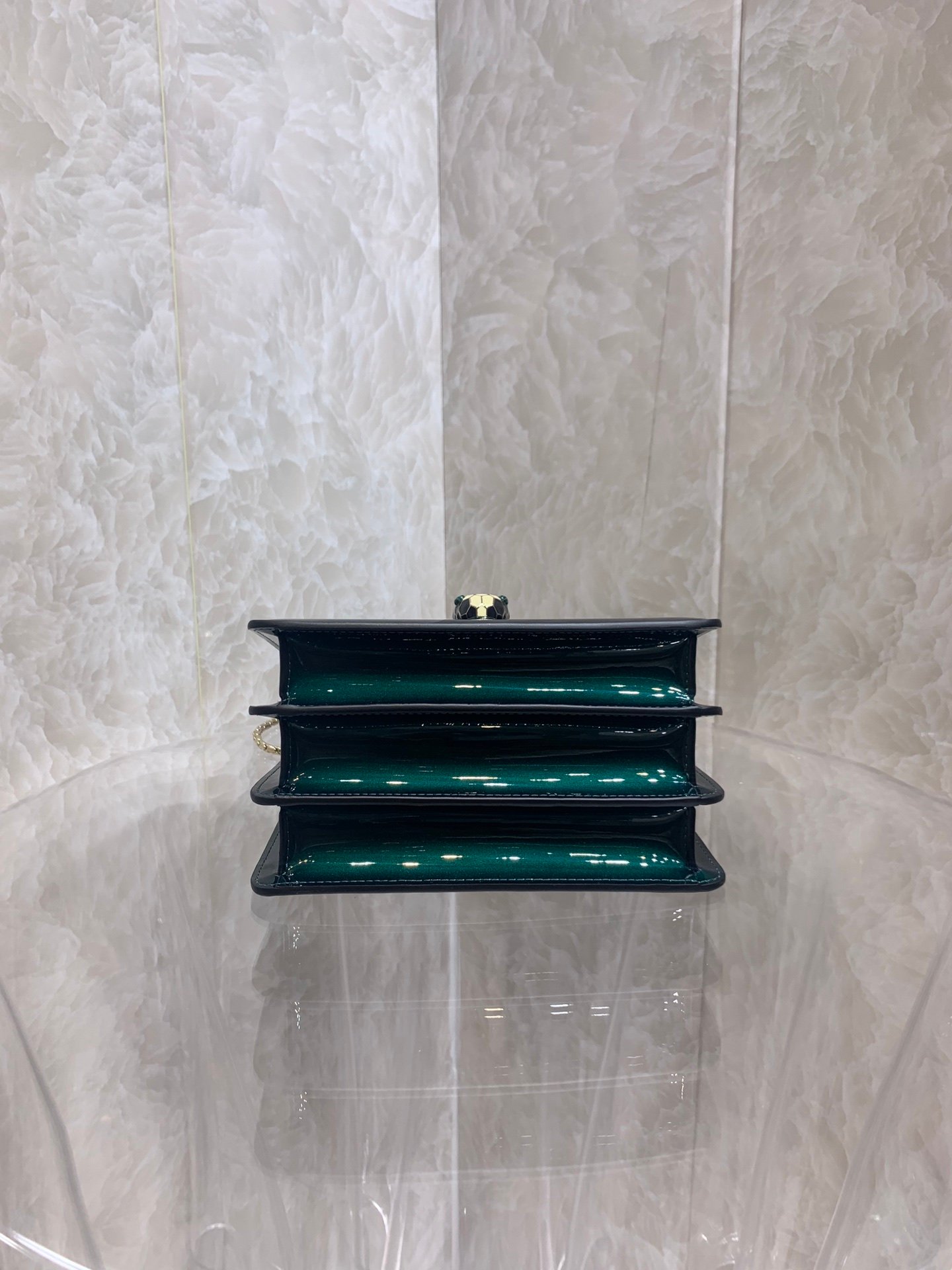 Iconic Closure: Features the signature Serpenti snakehead closure in gold-plated brass, embellished with black and white enamel scales and hypnotic green malachite eyes.