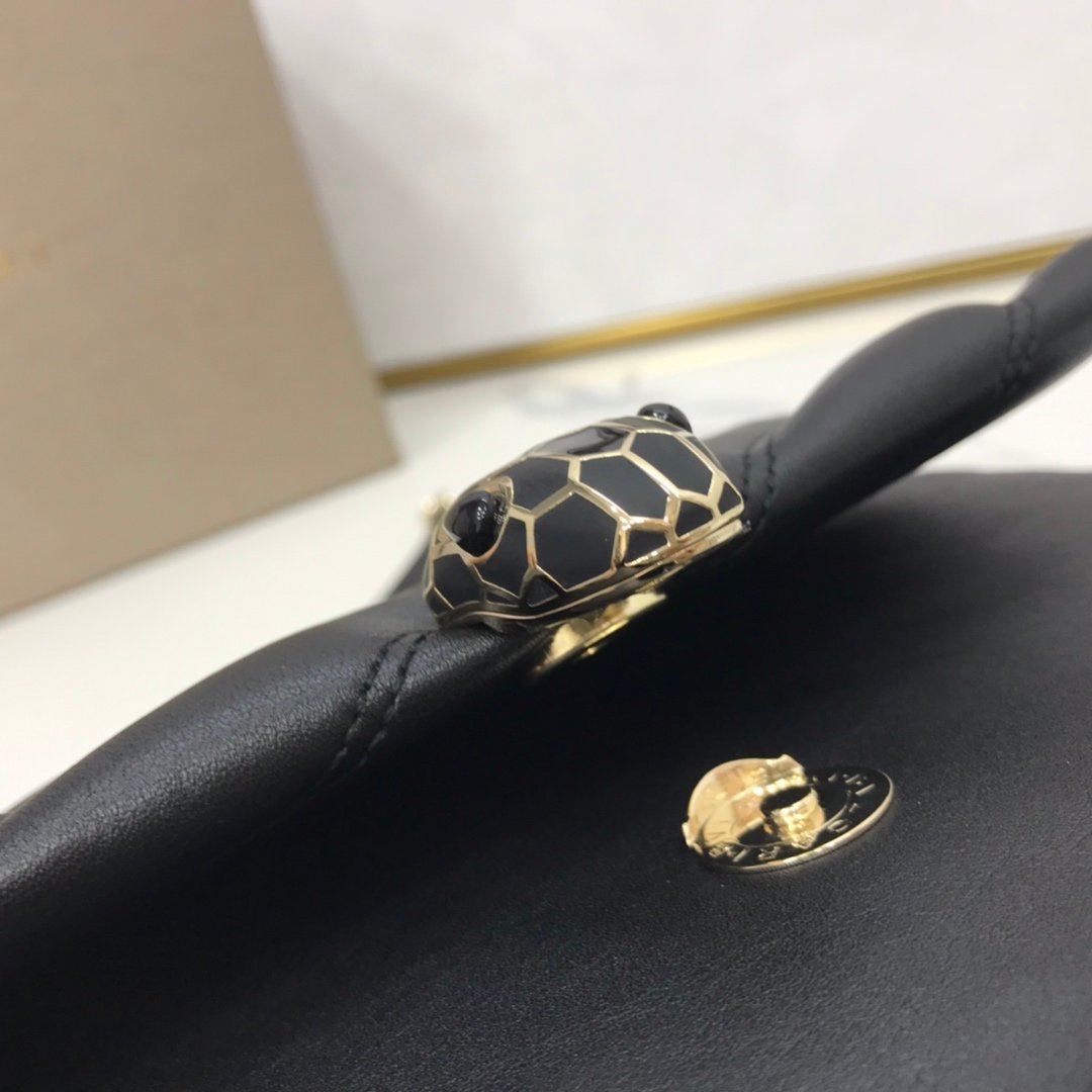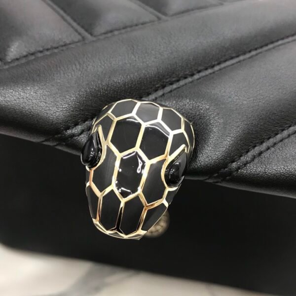 Jewelry-Grade Details The bag is secured by the iconic Snakehead closure, updated here with matte black and white enamel scales set in rose gold-plated brass, creating a striking contrast against the soft leather.