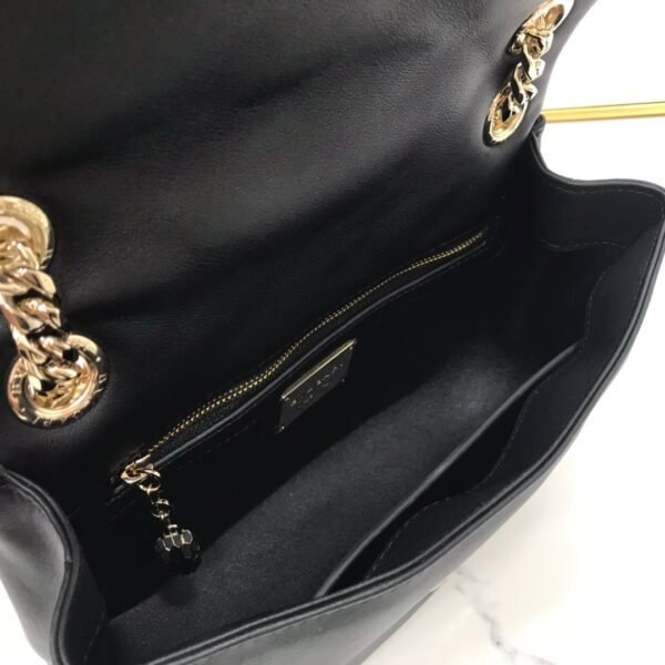Strap: Features a sliding “gourmette” chain strap with a leather shoulder pad, allowing for versatile shoulder or crossbody wear.