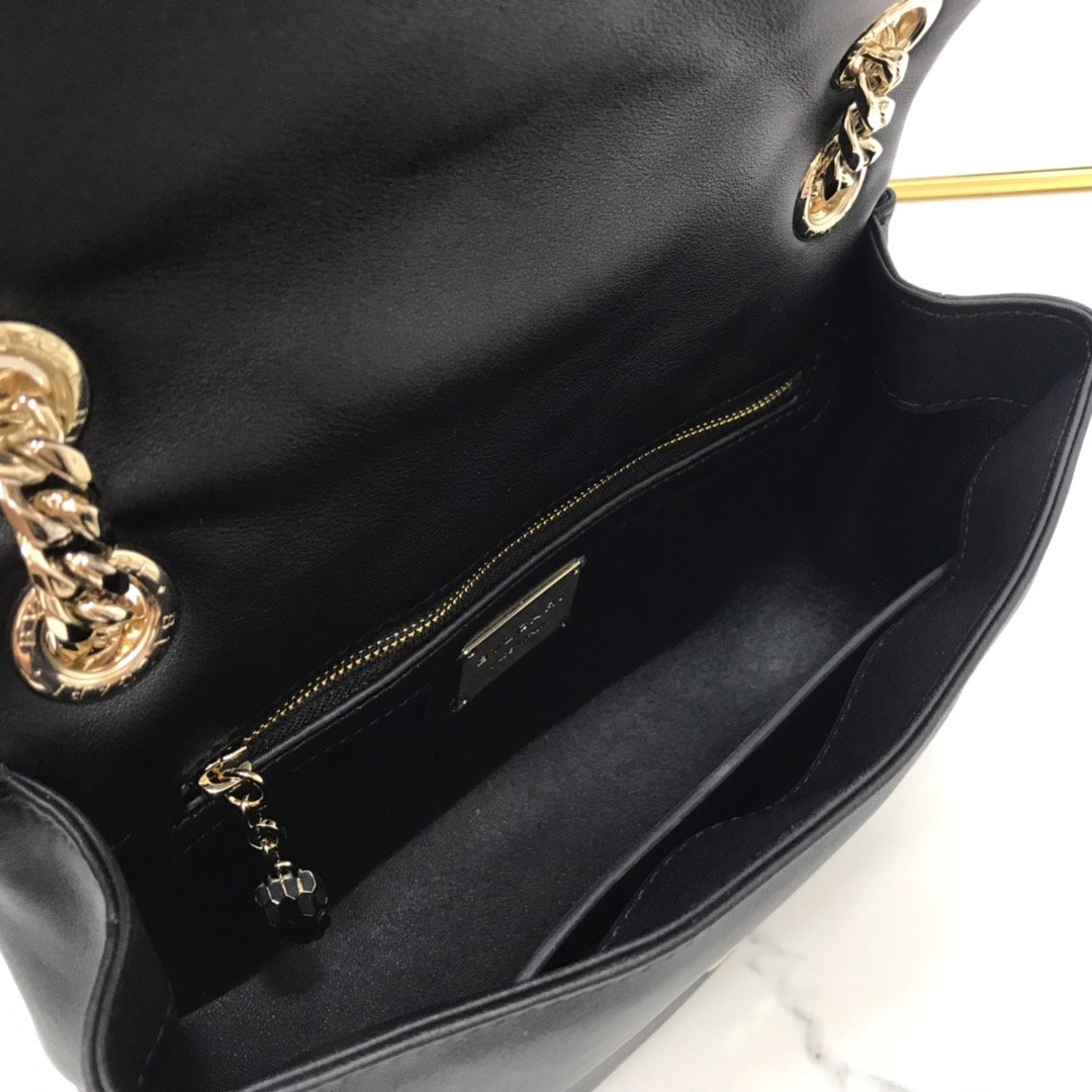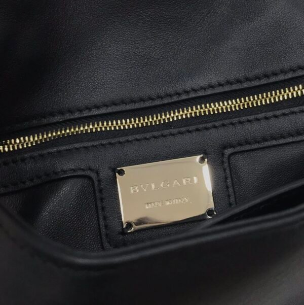 Interior: Designed with one main compartment, one internal zippered pocket, and one open pocket. Includes a metal tag engraved with the Bvlgari logo.