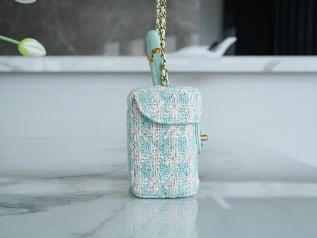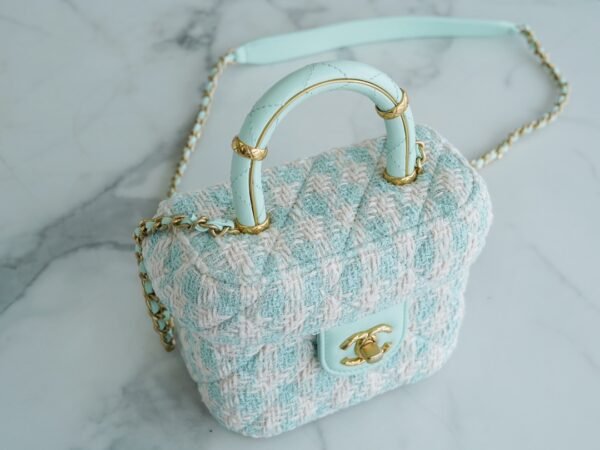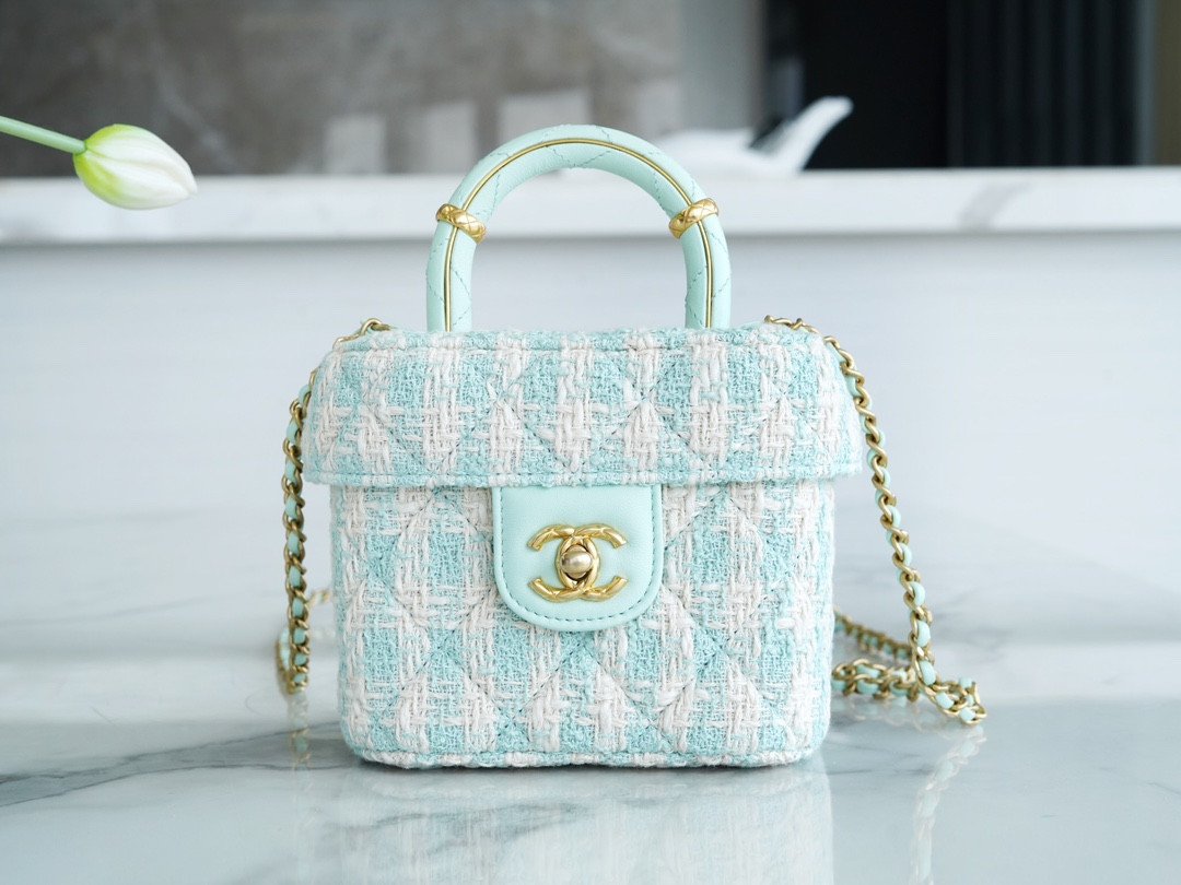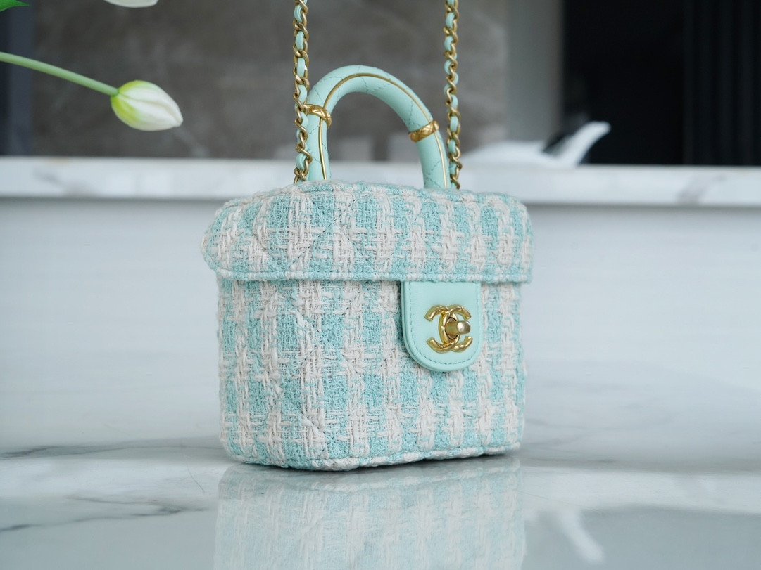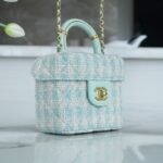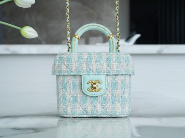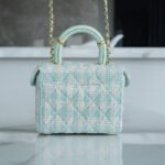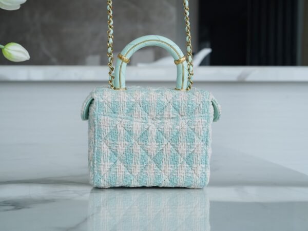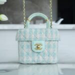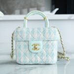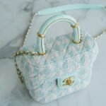 Who can possibly resist the charm of a classic Chanel top handle vanity? Arriving from the highly sought-after 23S collection, this exquisite mini box bag is a true wearable work of art. It brings a breath of fresh air to your wardrobe with its stunning mint green and white tweed construction, radiating a soft, spring-ready elegance that is absolutely breathtaking.