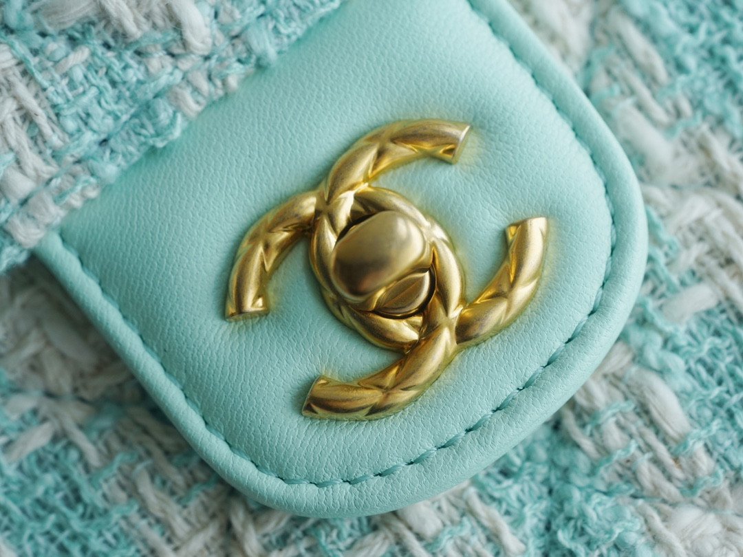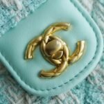The bag beautifully blends textures, pairing the signature diamond-quilted tweed body with smooth, premium calfskin leather on the front flap and top handle. The true standout feature of this design lies in its exquisite detailing: the top handle is uniquely adorned with two metallic “Coco rings,” adding a distinctive, high-end touch of jewelry-like craftsmanship to the silhouette.