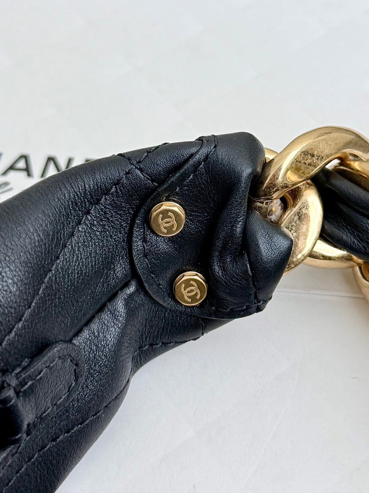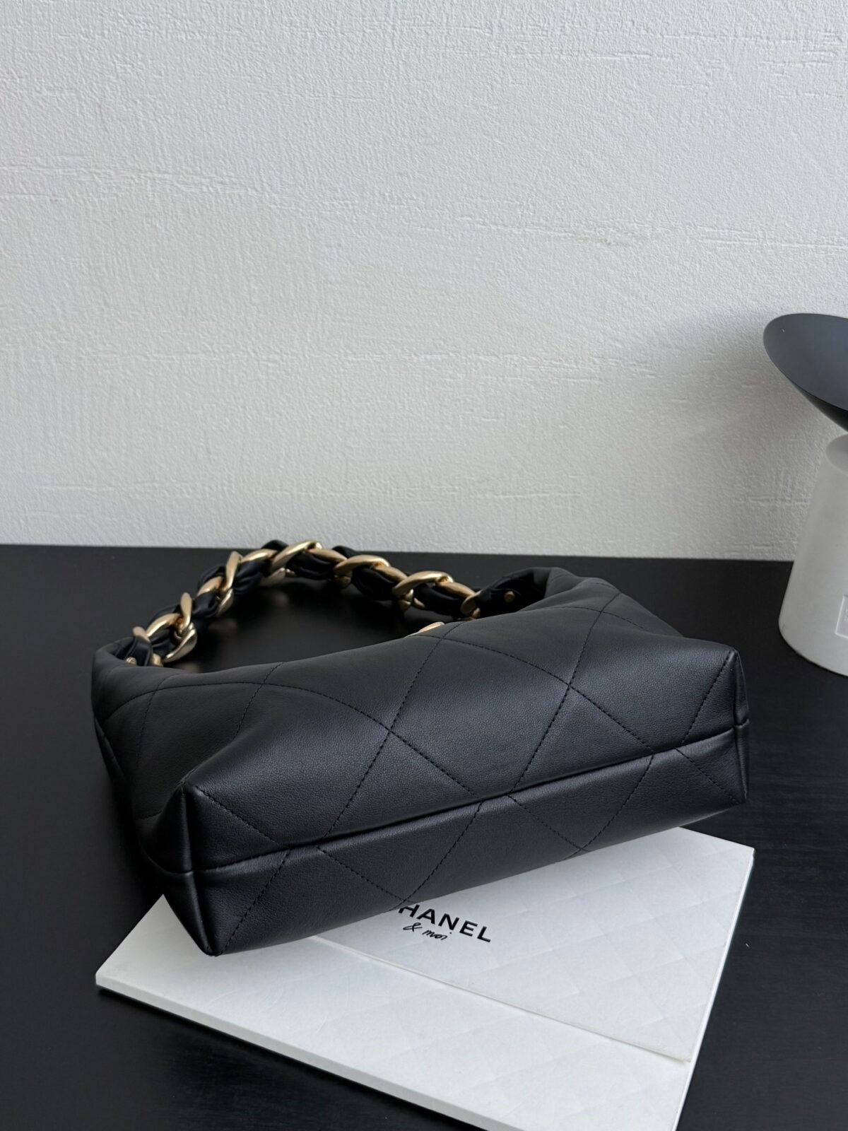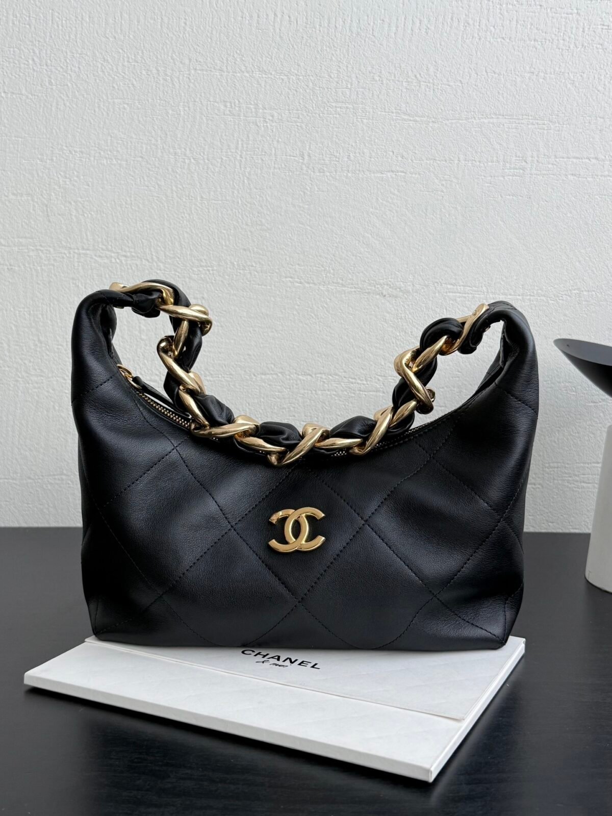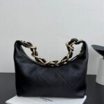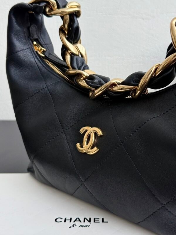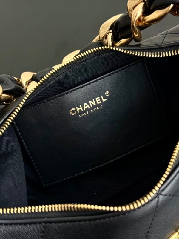 Discover effortless elegance with the Chanel 25K Chunky Chain Hobo Bag. Crafted from premium, ultra-soft black calfskin, this stunning underarm bag delivers a luxurious texture that elevates any outfit. The standout feature is its statement-making chunky gold-tone chain strap intertwined with leather. Despite this bold hardware, the bag is surprisingly lightweight and comfortable on the shoulder, making it the ultimate grab-and-go accessory.