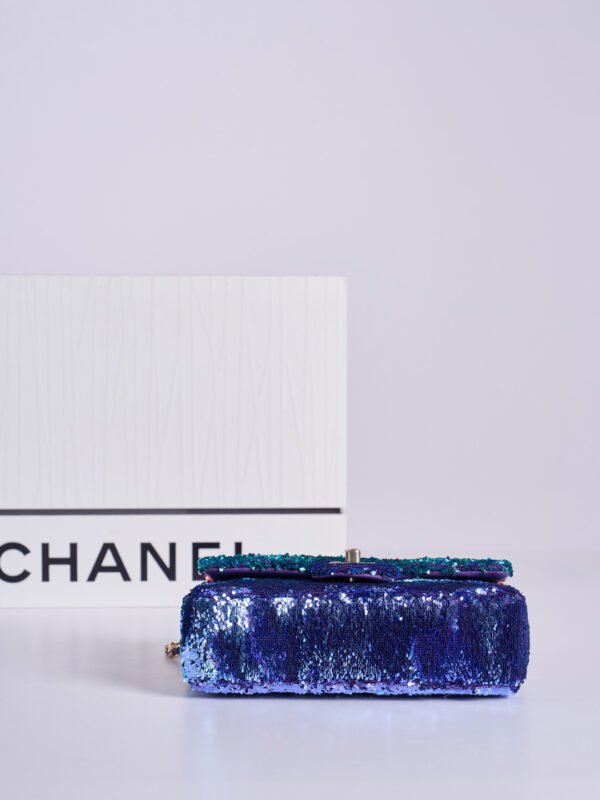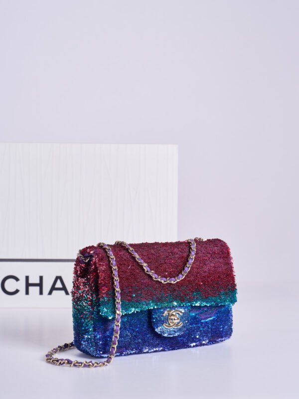 Prepare to fall in love with the ultimate dream bag from the CHANEL 25K Fall/Winter collection. This breathtaking Classic Flap bag is a true masterpiece of high-end craftsmanship, featuring a meticulously embroidered sequin exterior that creates a mesmerizing gradient color effect. Transitioning smoothly from deep burgundy to vibrant teal and rich blue, the dynamic sequins catch the light beautifully, offering an eye-catching, glamorous sparkle from every angle.