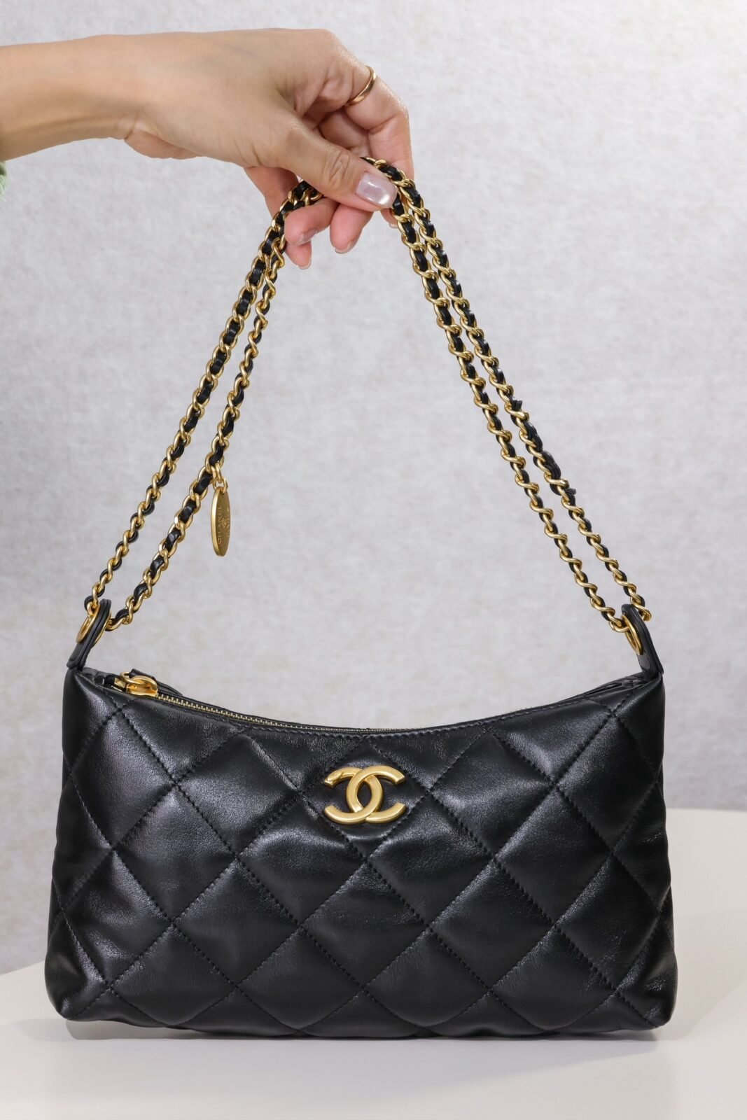 Designed with versatility in mind, the bag is equipped with a double-chain strap, allowing for multiple styling options. Wear it as a chic crossbody for a relaxed, on-the-go look, or carry it by hand for an elevated, elegant touch perfect for date nights. Despite its sleek profile, the bag offers an impressive capacity. The smartly designed interior features a large, easy-to-access pocket that comfortably holds all your daily essentials. Accented with thick-plated 24k vintage gold hardware and a unique statement coin charm, this hobo bag is the ultimate luxurious companion for capturing life’s beautiful moments from your daily commute to weekend outings.