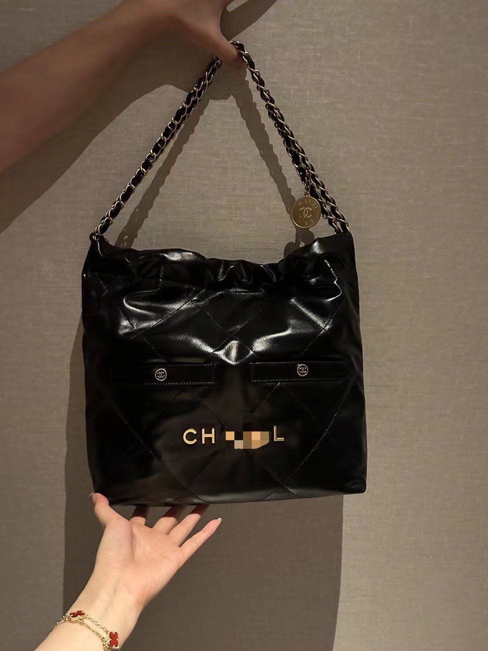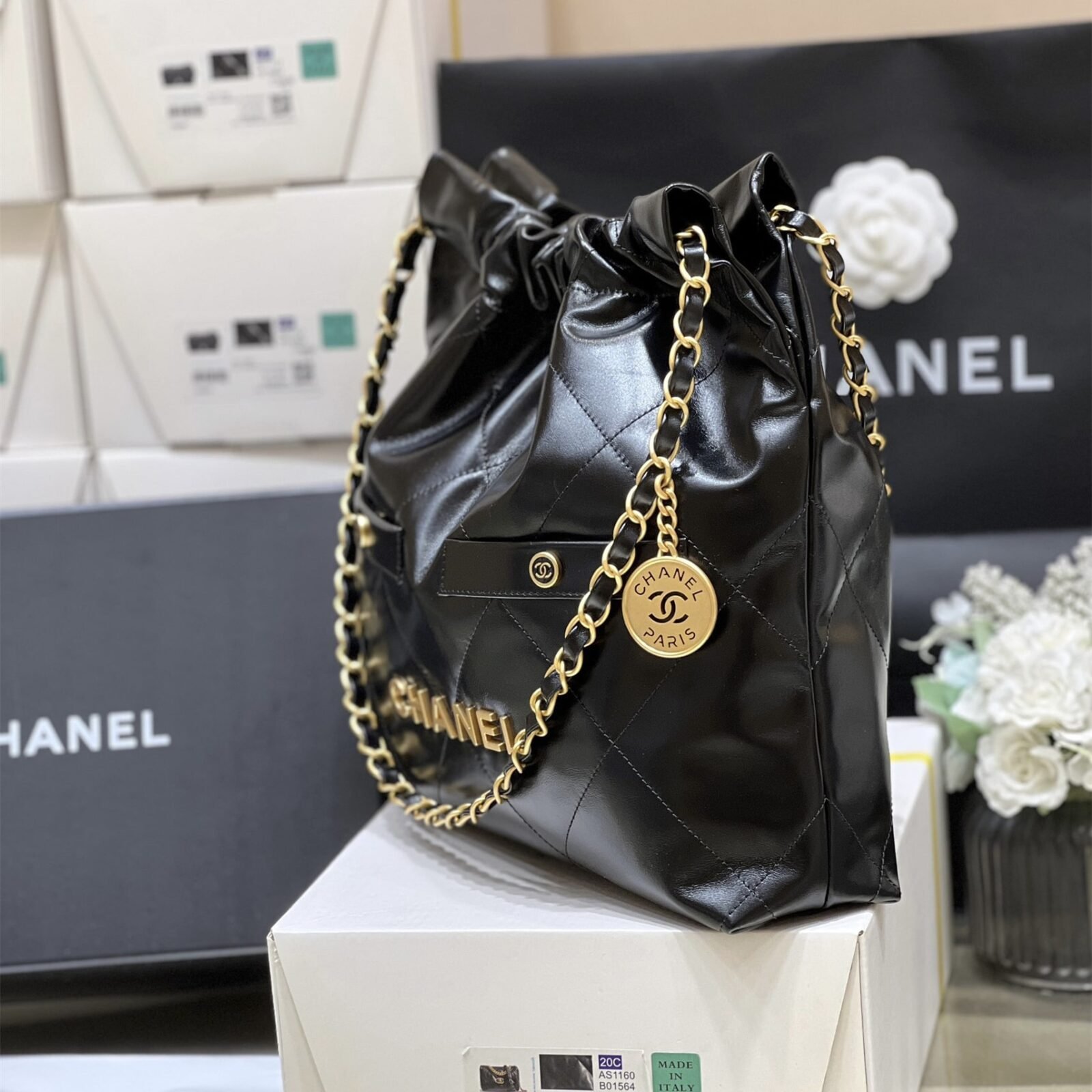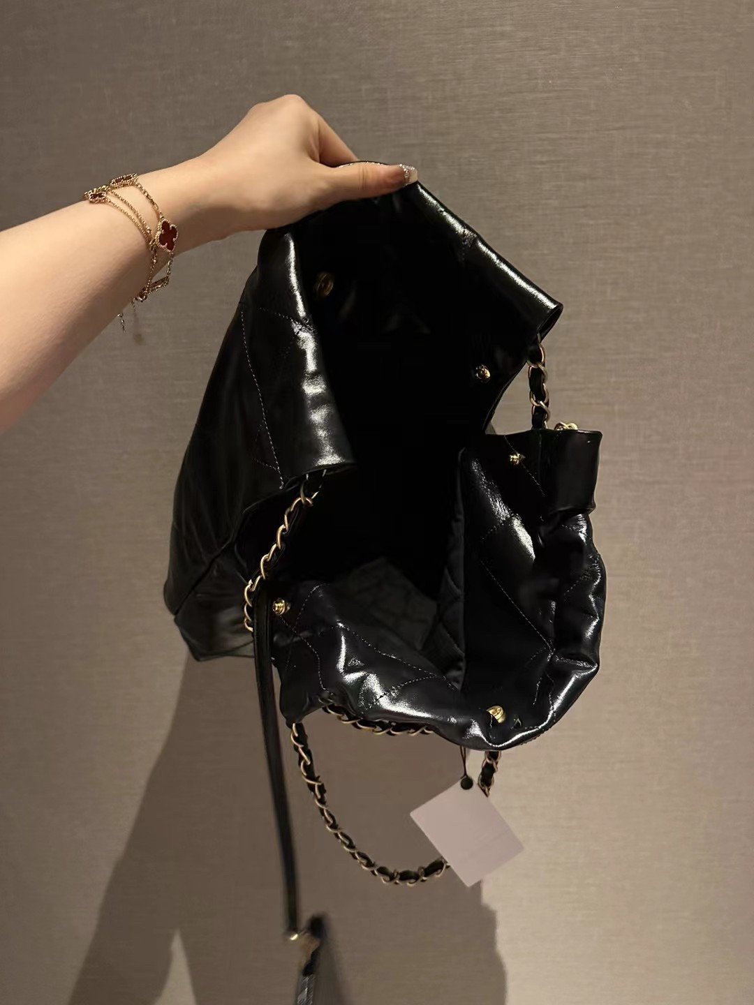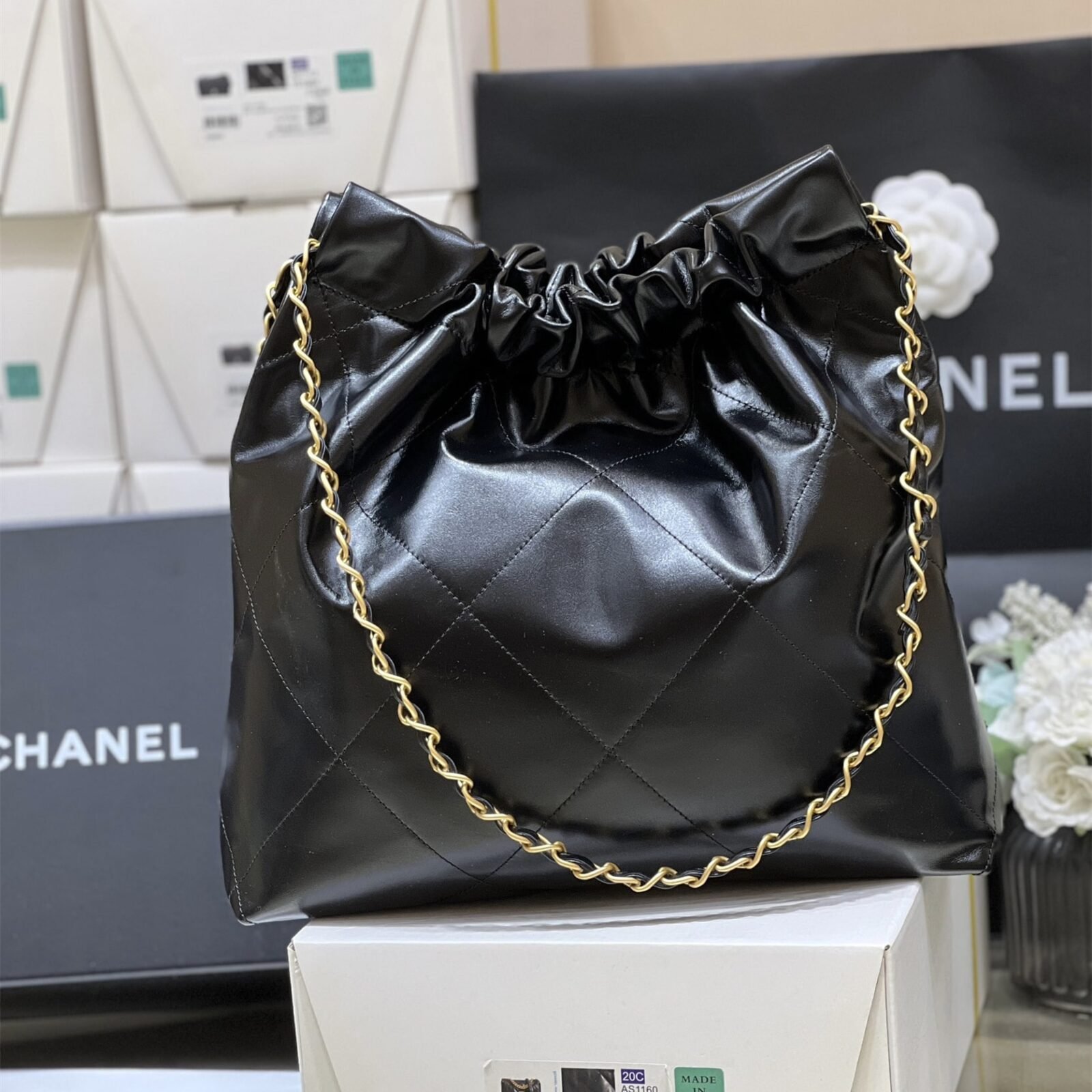 Experience timeless elegance with this exquisite, brand-new Chanel quilted black leather large hobo/tote bag. A perfect blend of classic style and contemporary functionality, this unique piece features oversized diamond quilting across supple, rich leather, complemented by a sophisticated drawstring-style closure integrated with the iconic interwoven gold-tone chain strap.