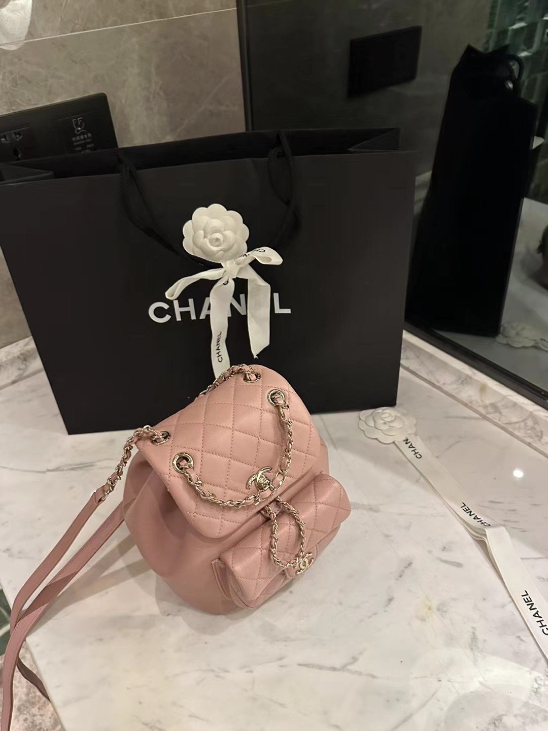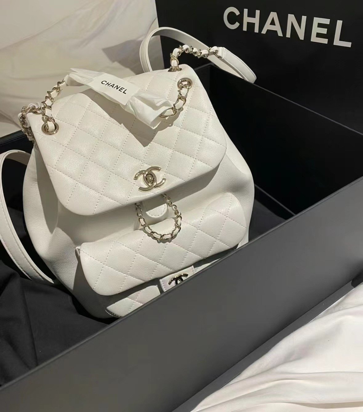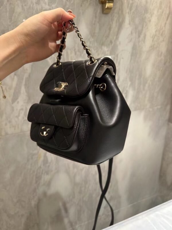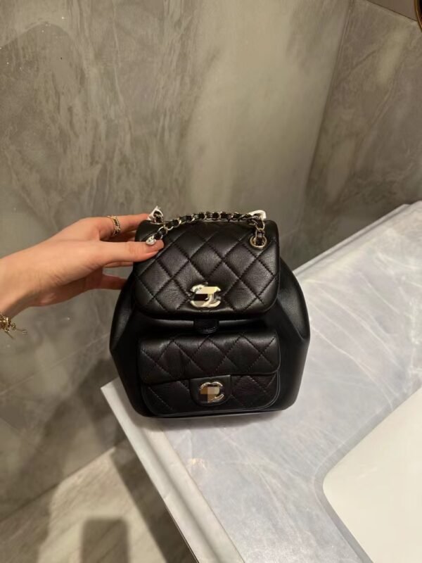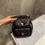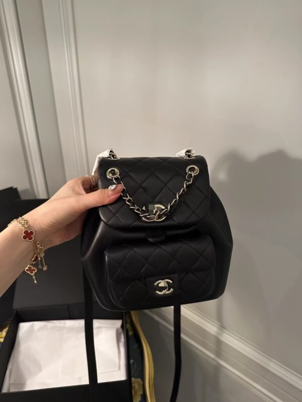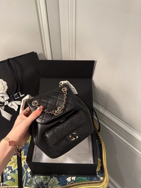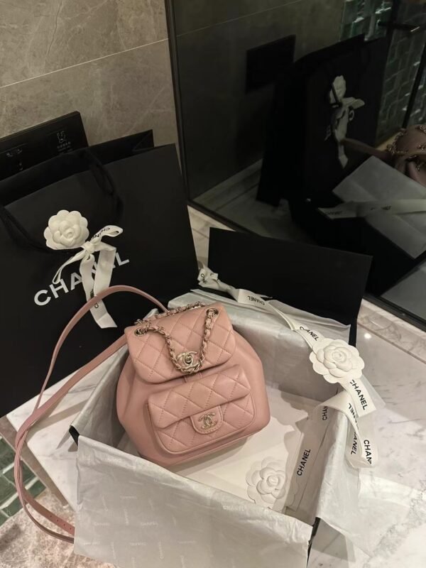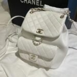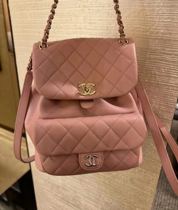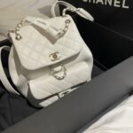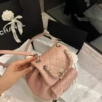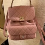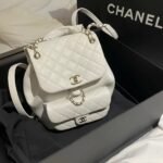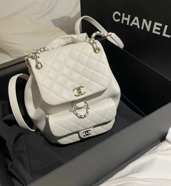 Classic Elegance This quilted backpack, available in three timeless colors (Deep Black, Pearl White, and Dusty Pink), combines luxury and functionality. It features the signature quilted pattern, dual-chain handles, and a polished interlocking ‘CC’ logo, making it an essential piece for any discerning collector.