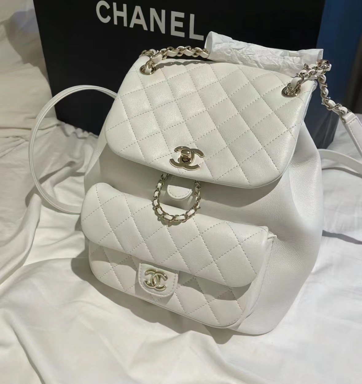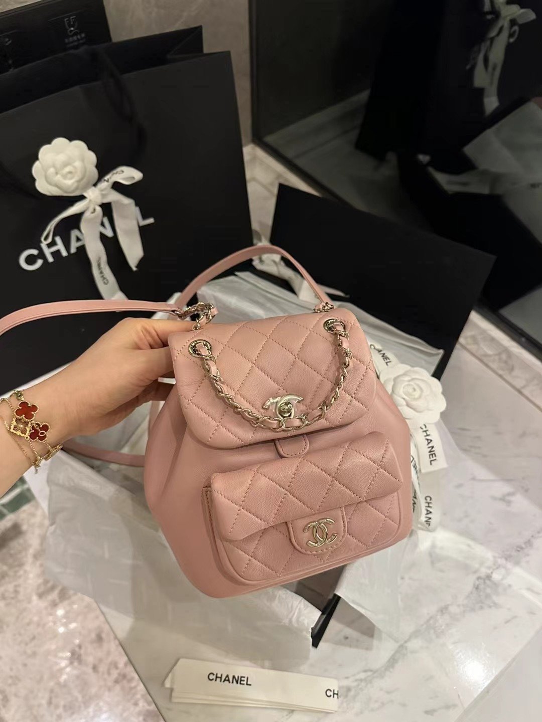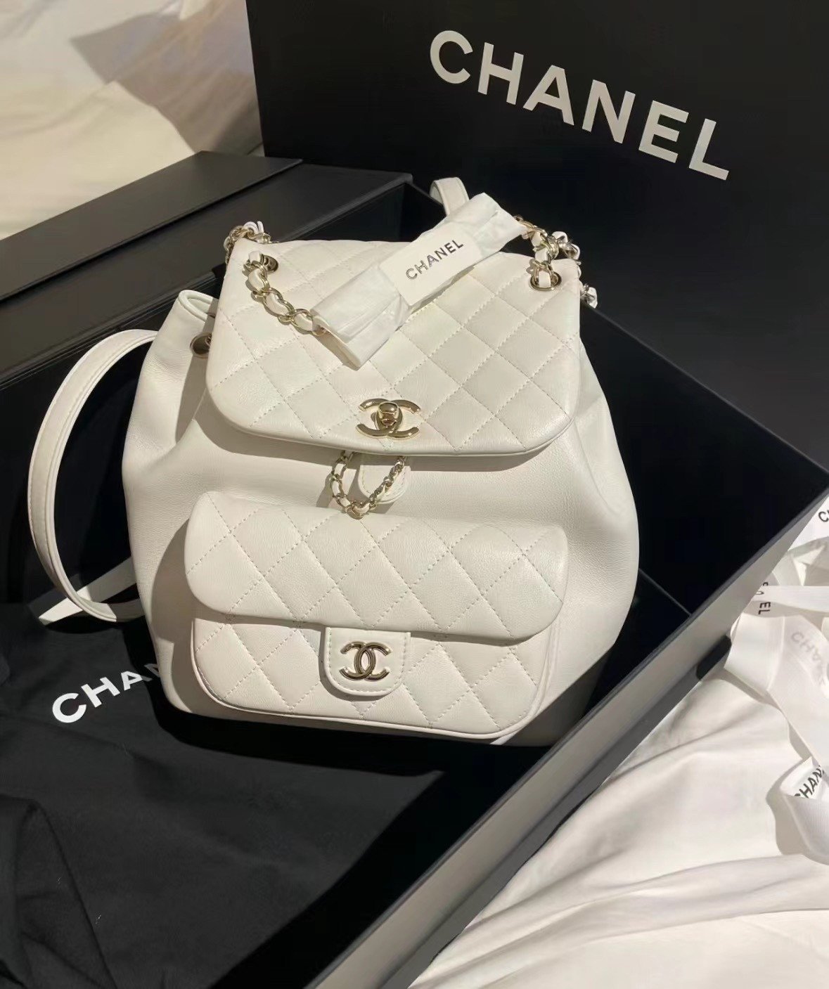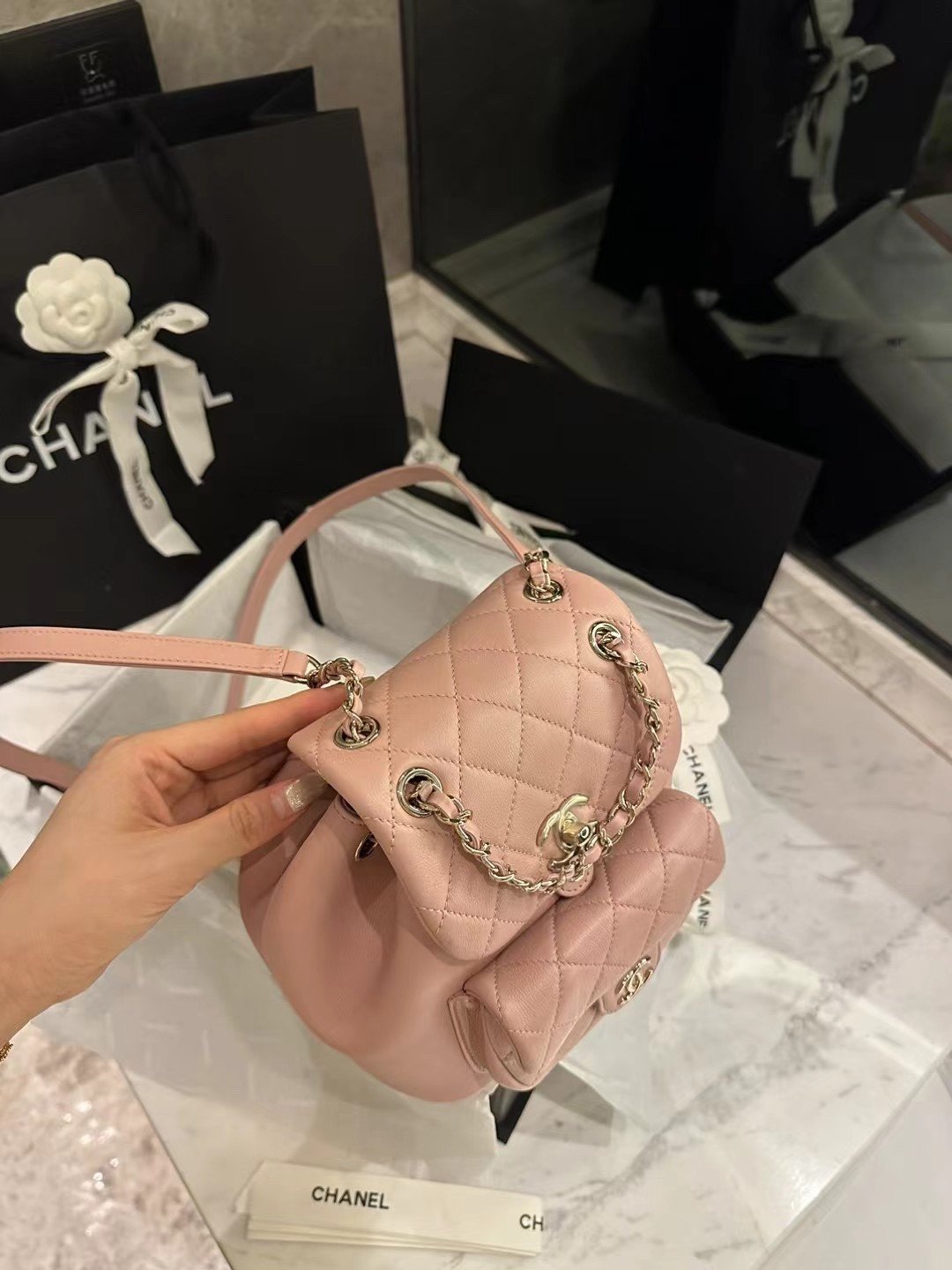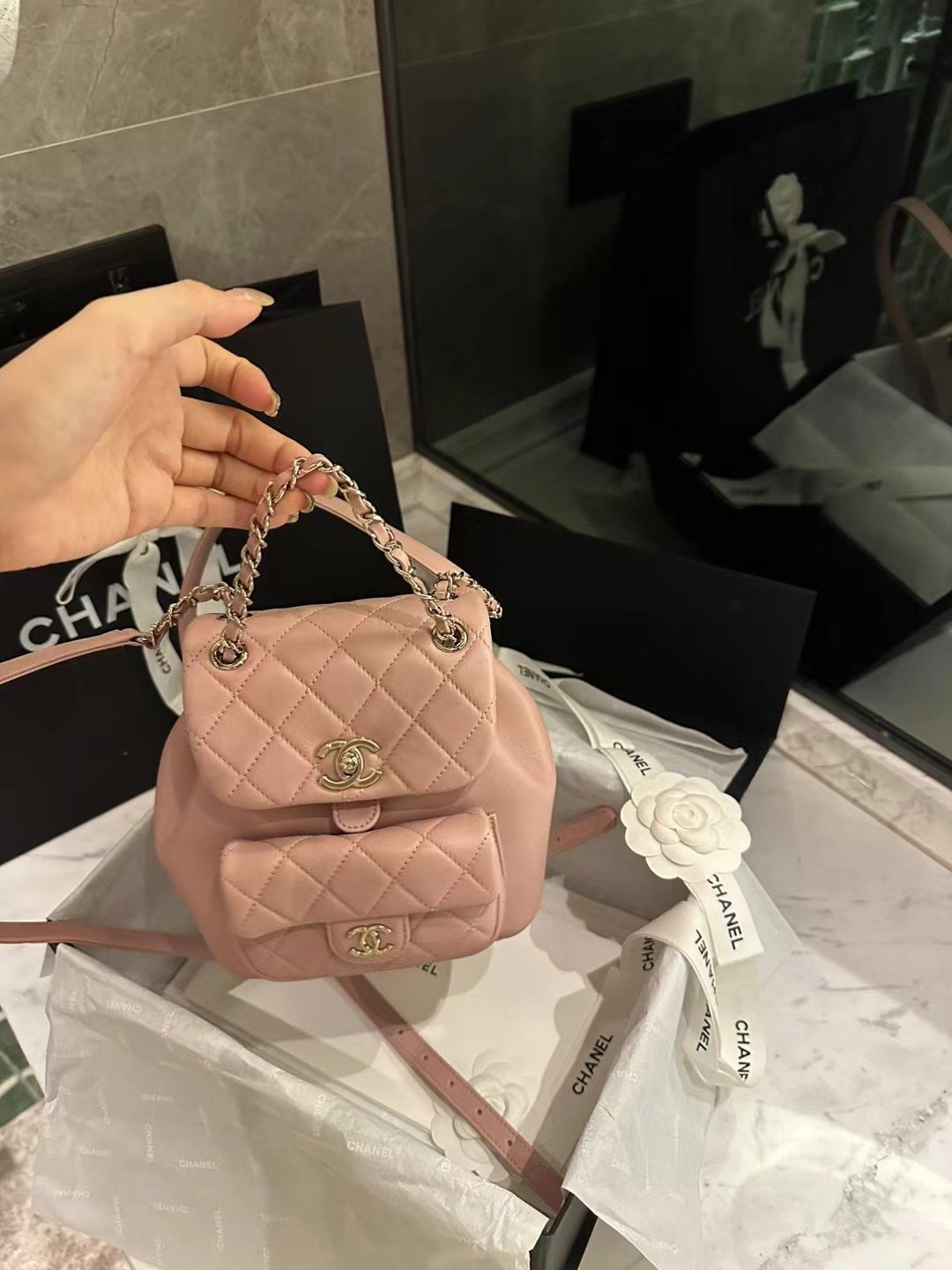 Classic Elegance This quilted backpack, available in three timeless colors (Deep Black, Pearl White, and Dusty Pink), combines luxury and functionality. It features the signature quilted pattern, dual-chain handles, and a polished interlocking ‘CC’ logo, making it an essential piece for any discerning collector.