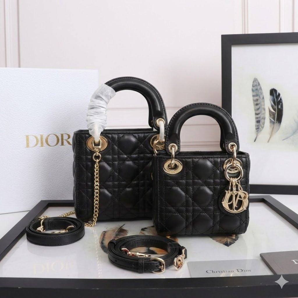 Experience the profound elegance and timeless beauty of the House with these exquisite iterations of the classic Lady Dior handbag. Meticulously crafted from exceptionally soft, imported premium lambskin leather, these pieces are beautifully enveloped in the iconic Cannage topstitching, offering a rich, quilted texture that never goes out of style. The design is instantly elevated by the signature, original-grade metal ‘D.I.O.R.’ charms that hang gracefully from the top handle, adding a touch of dynamic luxury.