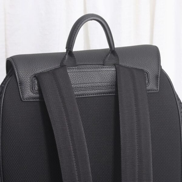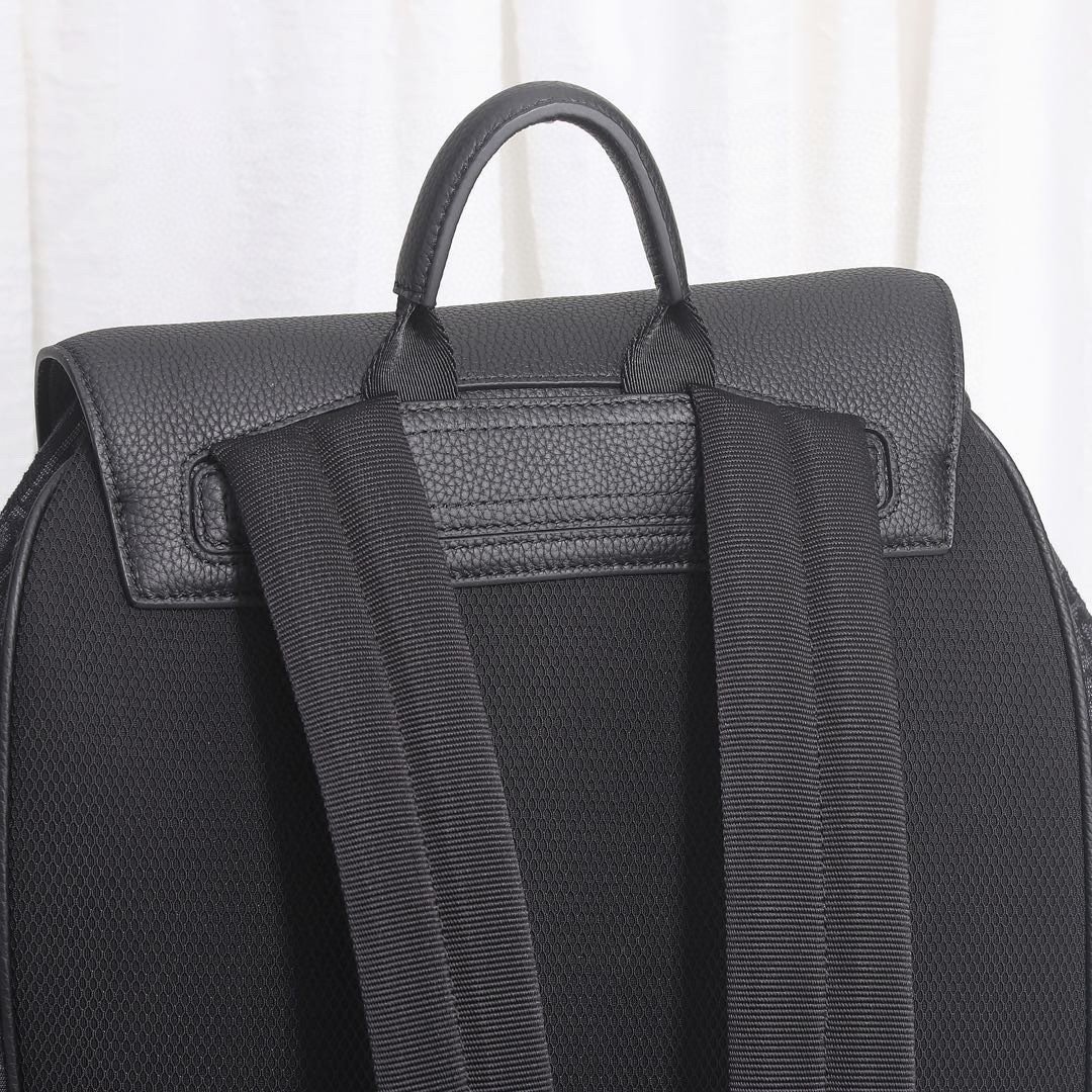 Designed for ease of movement, it features a leather top handle for hand carrying and two adjustable black nylon shoulder straps adorned with black calfskin trim for durability and comfort.