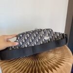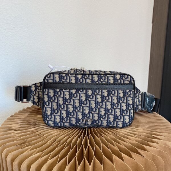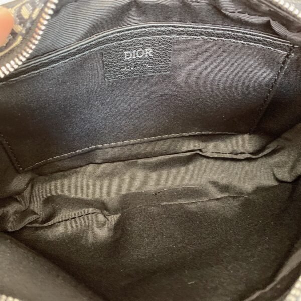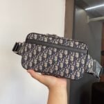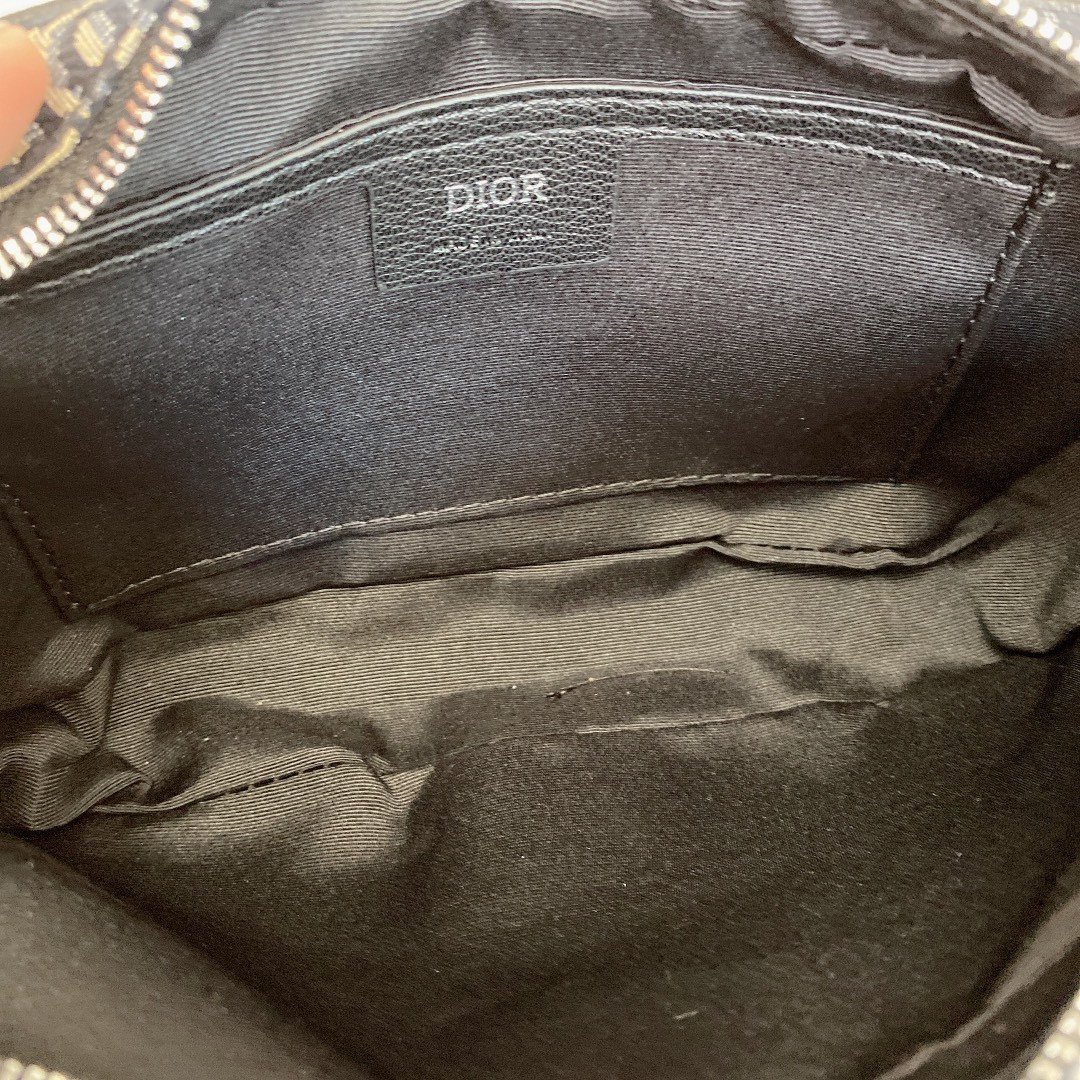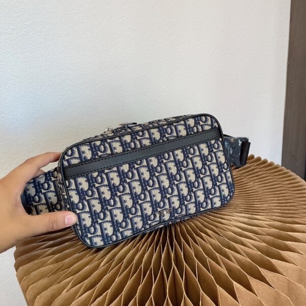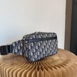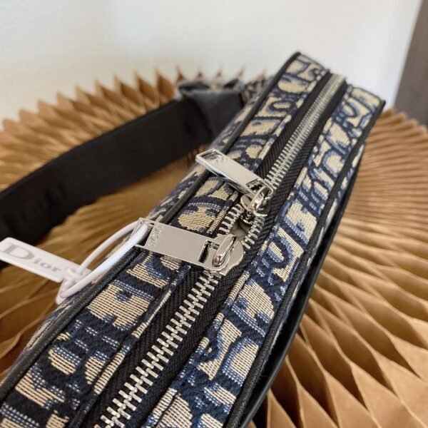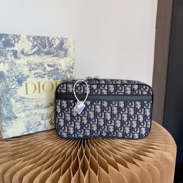 Crafted from high-quality original factory materials, this bag features the House’s timeless Blue Dior Oblique Jacquard motif. The design is refined with black cowhide leather details along the trim and zipper line. Unlike other models, this version features a discreet and sophisticated silver-tone metal “DIOR” signature centered on the front, adding a touch of minimalist luxury.