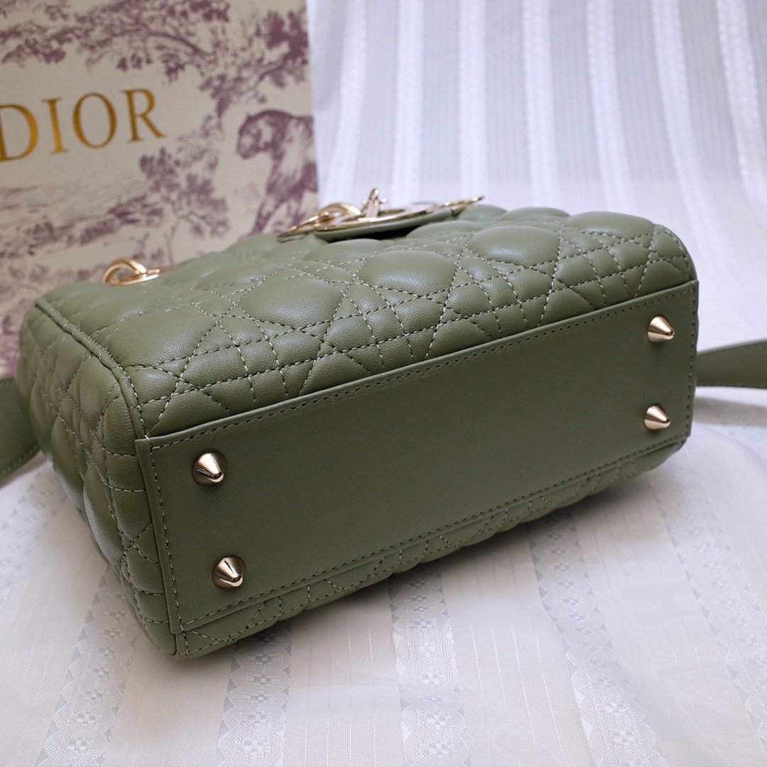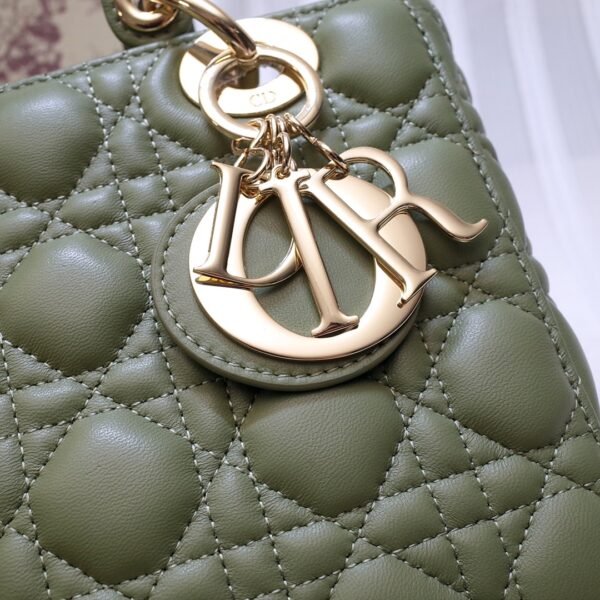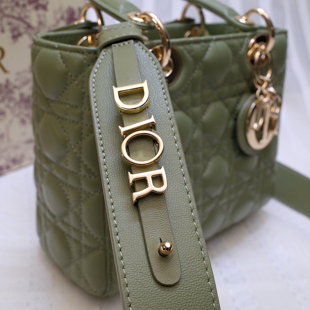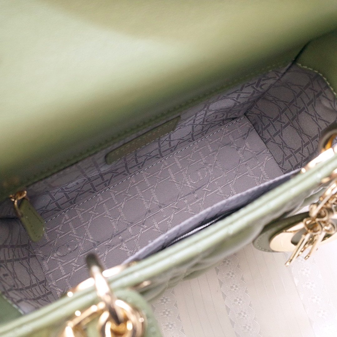 This stunning 4-grid edition is famously characterized by its iconic Cannage quilted topstitching, a legendary geometric pattern directly inspired by the woven rattan of historic Napoleon III chairs. It is meticulously crafted from top-grade imported cowhide leather, offering a luxurious, supple, and durable finish. Showcased in a stunning olive green hue, the bag is elevated by exceptional artisanal details, most notably the original-grade metal hardware featuring the four ‘D.I.O.R.’ charms suspended from the sturdy top handles, which are meticulously installed entirely by hand.