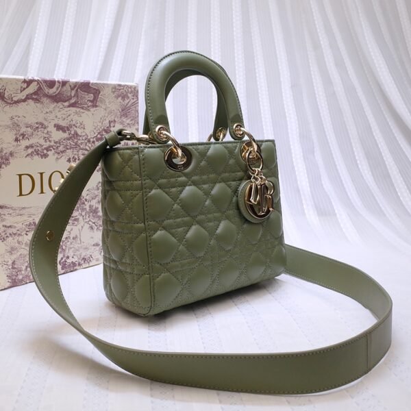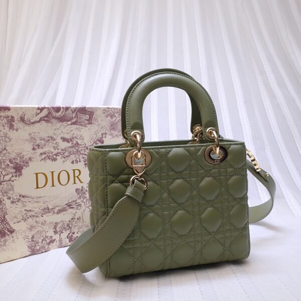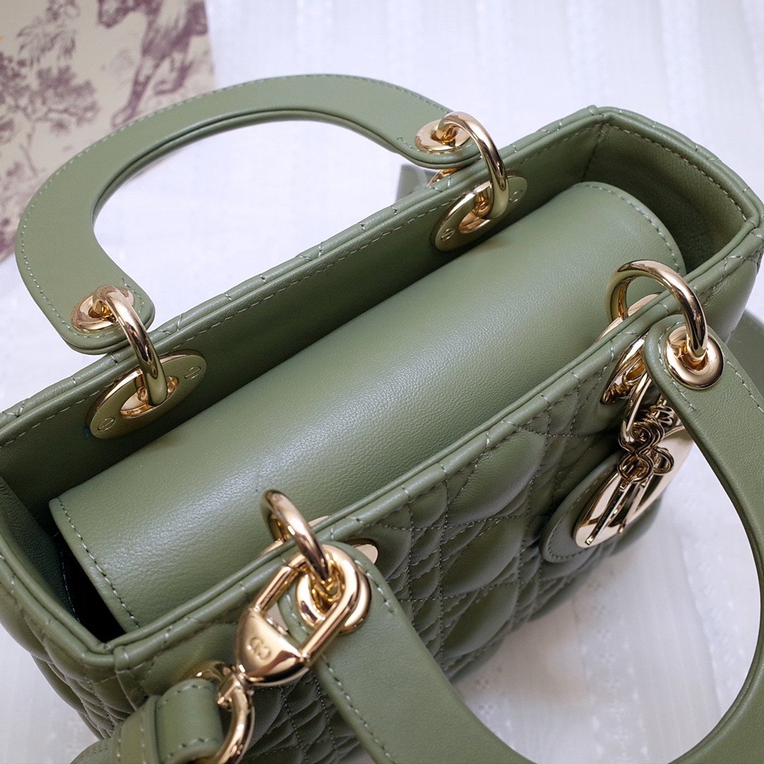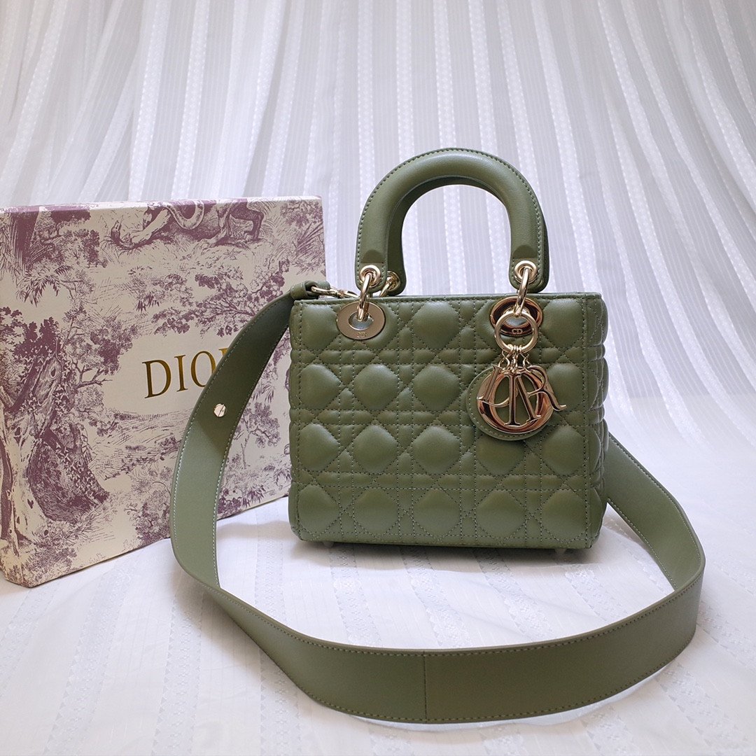 This stunning 4-grid edition is famously characterized by its iconic Cannage quilted topstitching, a legendary geometric pattern directly inspired by the woven rattan of historic Napoleon III chairs. It is meticulously crafted from top-grade imported cowhide leather, offering a luxurious, supple, and durable finish. Showcased in a stunning olive green hue, the bag is elevated by exceptional artisanal details, most notably the original-grade metal hardware featuring the four ‘D.I.O.R.’ charms suspended from the sturdy top handles, which are meticulously installed entirely by hand.
