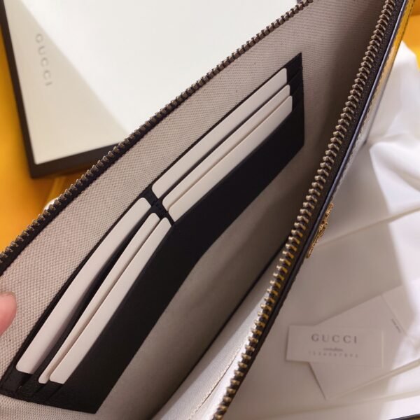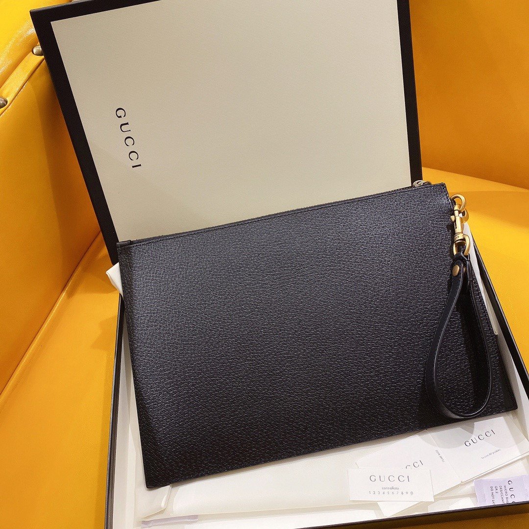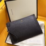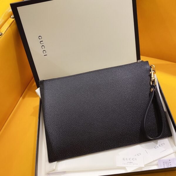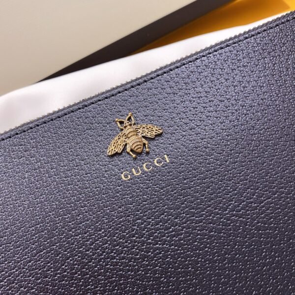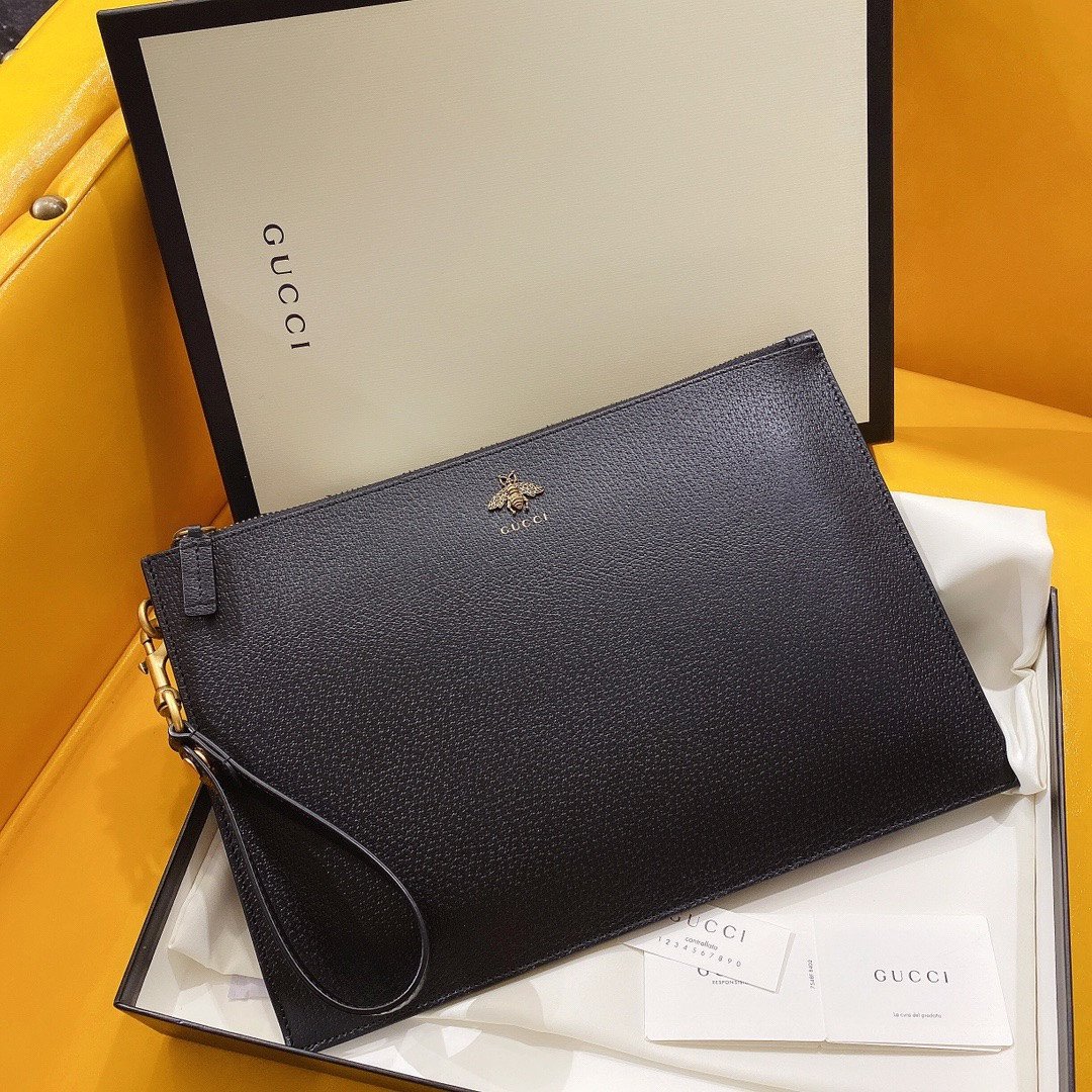 Premium Leather & Iconic Archival Details Expertly crafted entirely from premium, full-grain textured black leather, the clutch offers a luxurious, tactile, and highly durable feel. The undisputed focal point of this elegant silhouette is the striking gold-toned metallic bee emblem resting proudly on the front face, accompanied by the classic Gucci lettering. This iconic bee motif is a beloved historical code taken directly from the brand’s 1970s archives, adding a touch of vintage sophistication.
