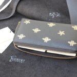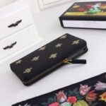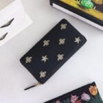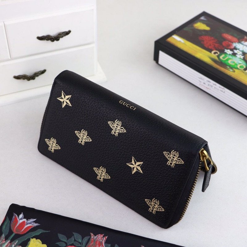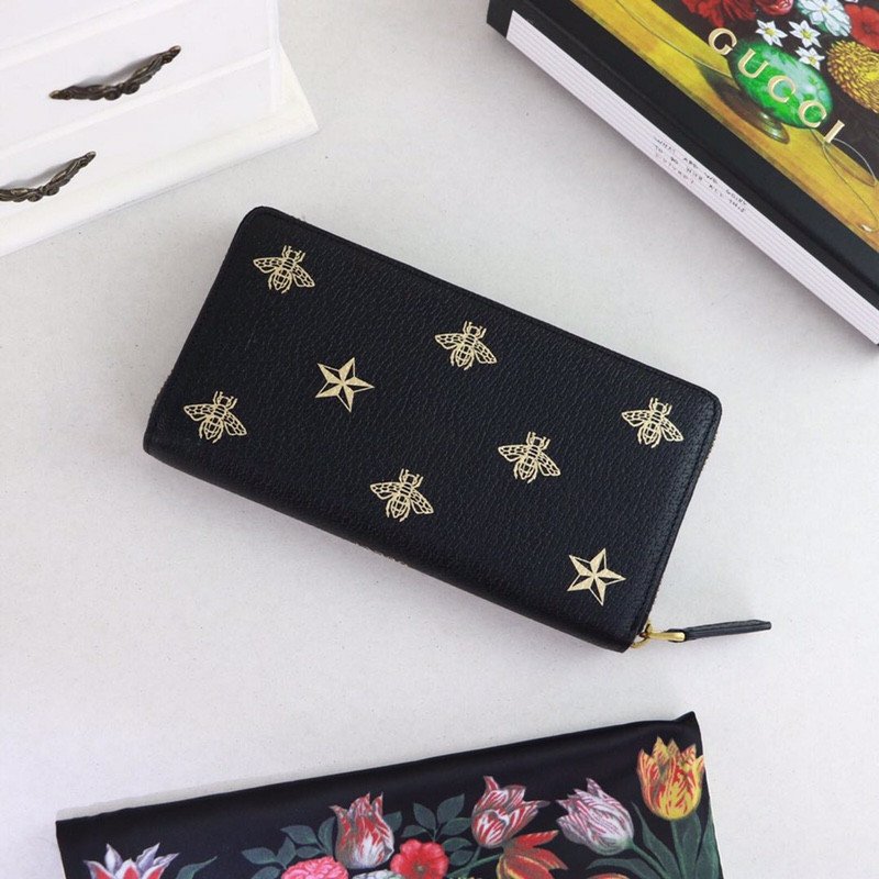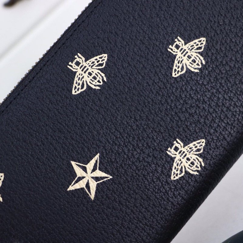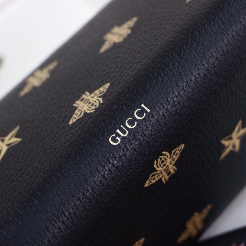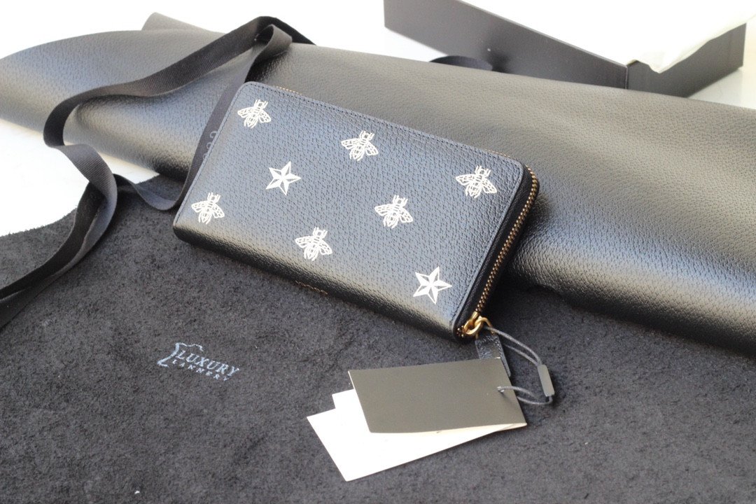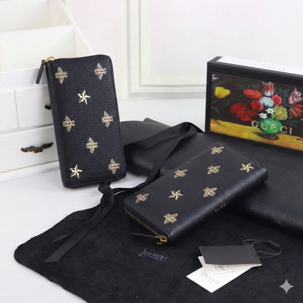 Constructed utilizing imported, top-layer cowhide, this full black leather wallet provides a rich, substantial, and durable tactile experience. The smooth, dark leather serves as the perfect canvas for the wallet’s defining feature: an exquisite metallic gold print. The design proudly showcases the iconic Gucci bee—a deeply historic symbol drawn directly from the House’s 1970s archives—beautifully interspersed with matching gold star motifs.