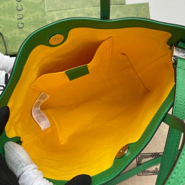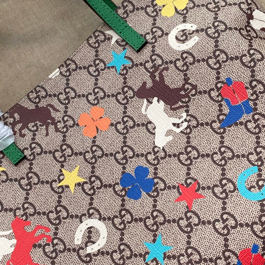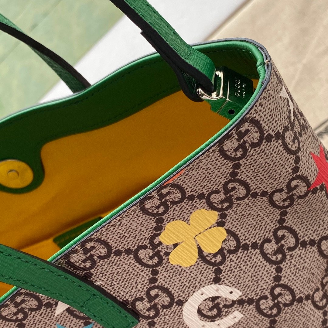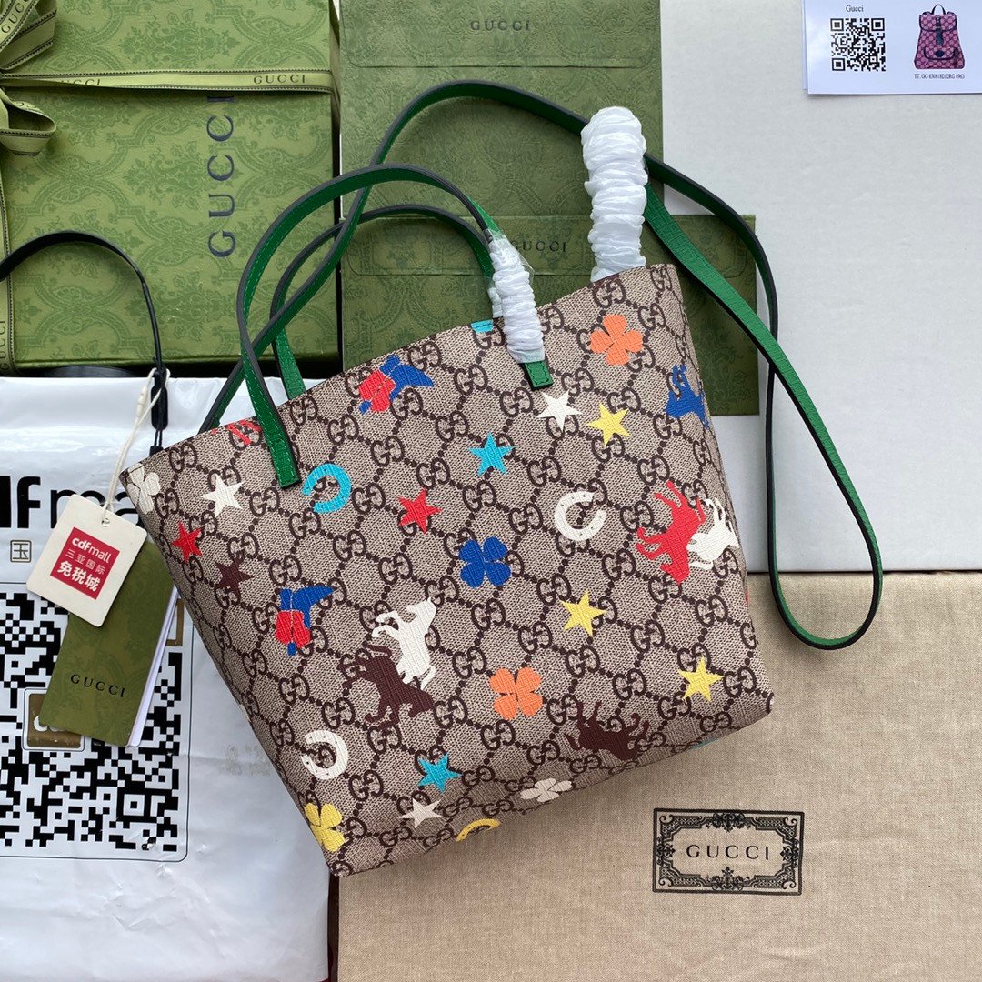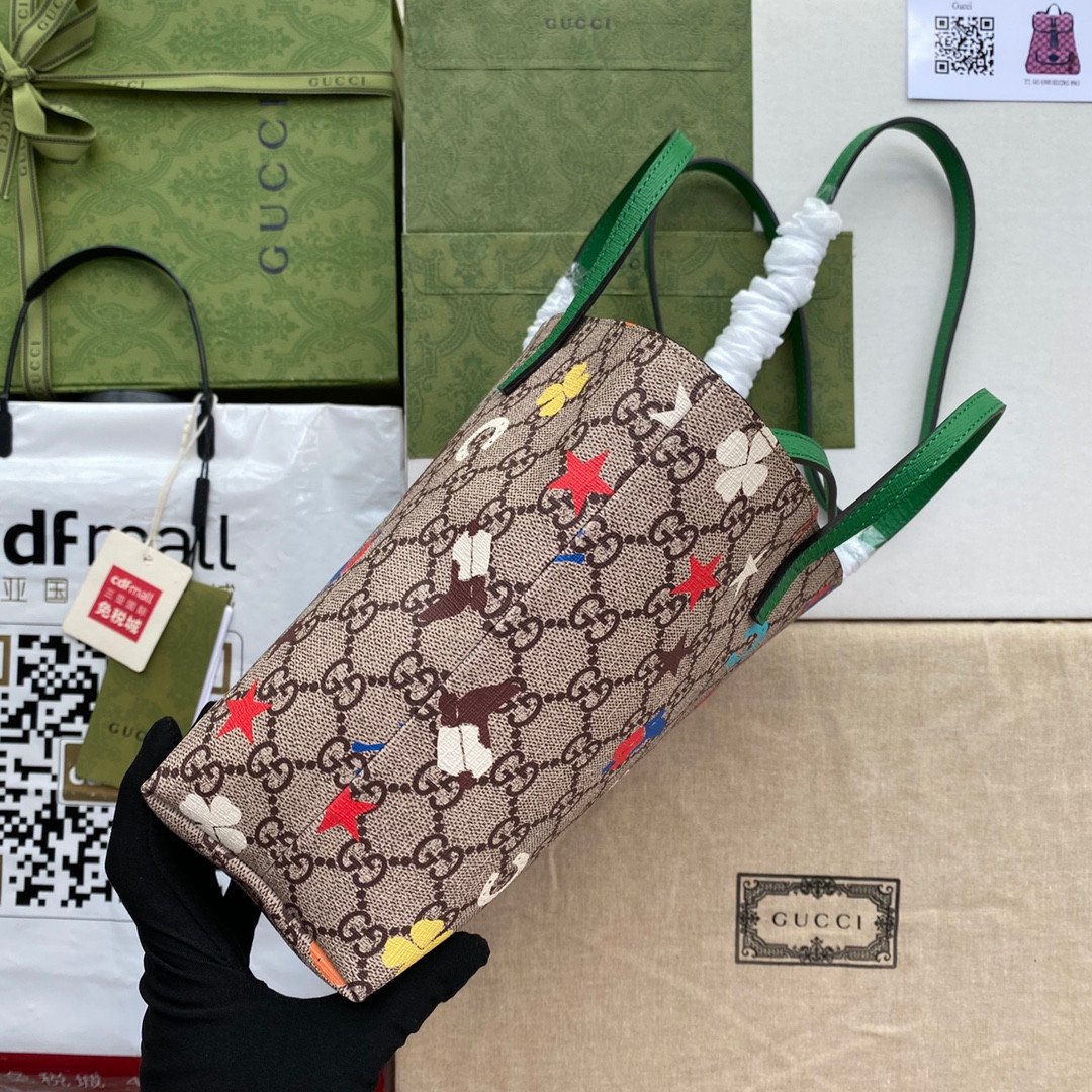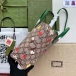Add a touch of whimsy to your everyday style with this exquisite Gucci Mini Tote Bag (Style 585933). Perfectly blending Gucci’s heritage with playful, vibrant designs, this bag is a standout accessory. Crafted from the iconic beige and ebony GG Supreme canvas, it serves as the perfect backdrop for its eye-catching motifs.