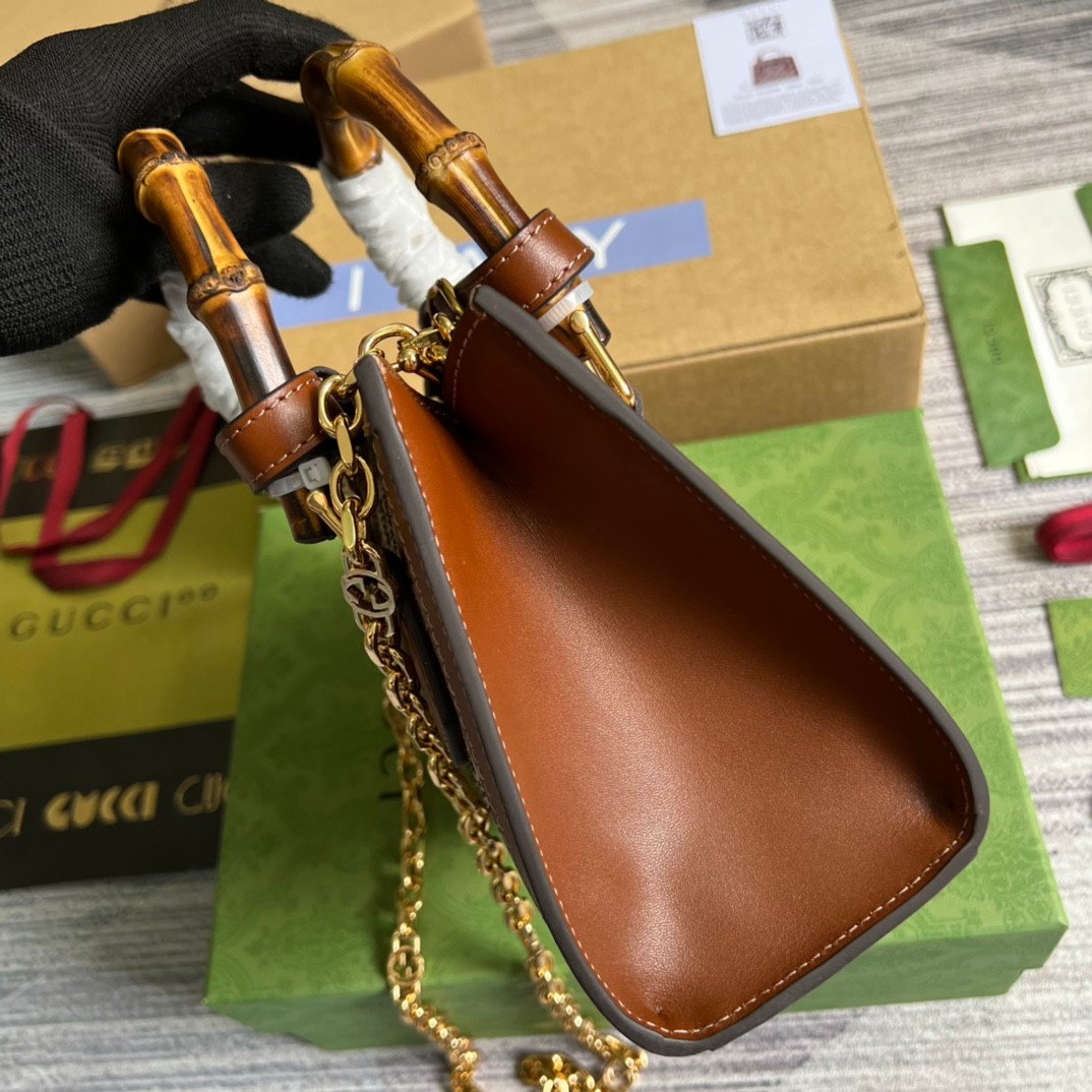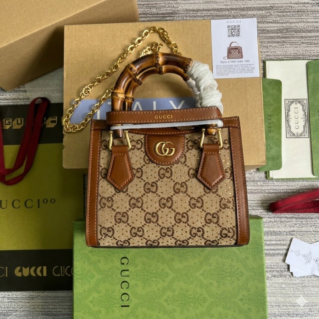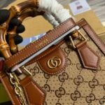Glamorous Craftsmanship & Archival Details The bag is expertly crafted from a rare, glossy brown GG canvas that is beautifully embellished with small, sparkling diamonds for a highly eye-catching finish. This stunning exterior is perfectly complemented by the line’s signature natural bamboo top handles, paying tribute to iconic Gucci designs of the past. The front face is anchored by the recognizable gold-toned Double G emblem, seamlessly tying the luxurious aesthetic together.