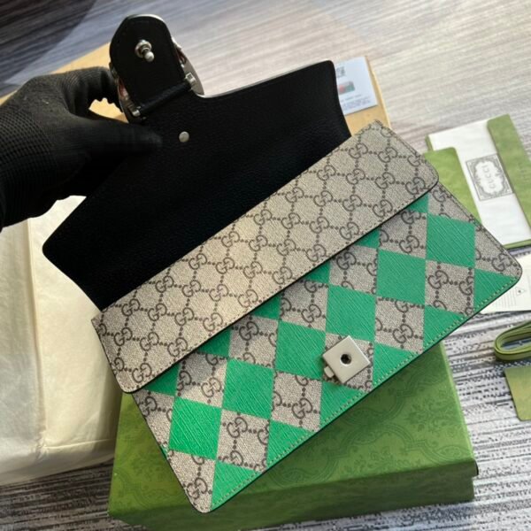 The classic GG Supreme canvas serves as the backdrop for a vivid green diamond/argyle pattern and a striking central red and orange stripe. The bag is elegantly distinguished by the bold, white gothic-style “Centum” print plastered across the front flap, offering an undeniably unique and captivating charm.