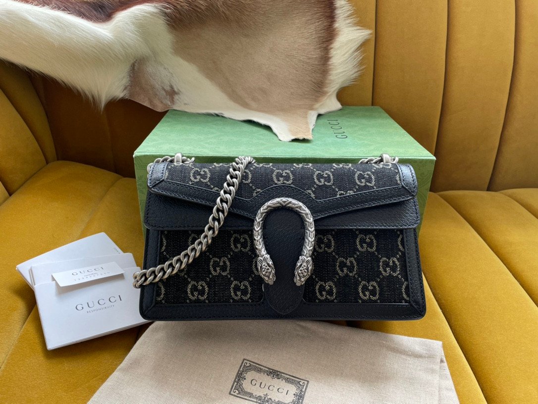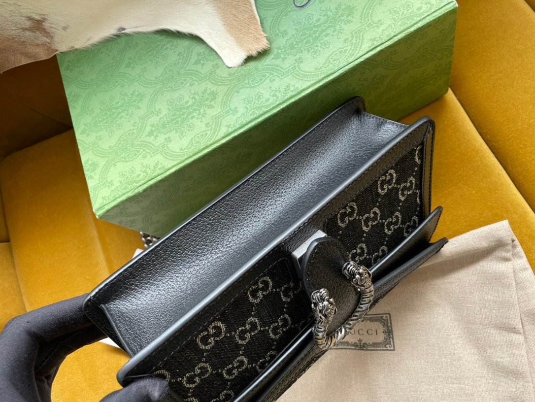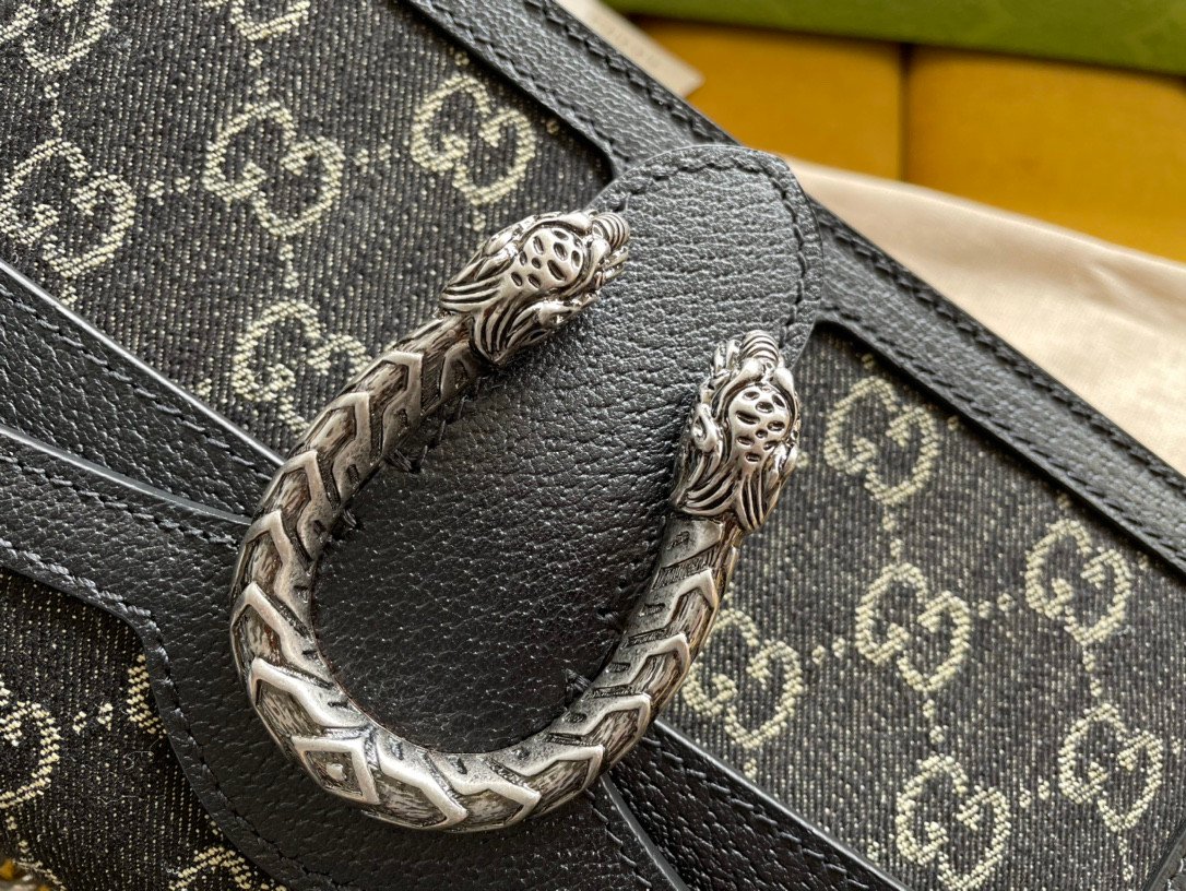 Constructed to exacting “original factory” boutique standards, this particular Dionysus variation offers a highly modern, textural twist. The exterior is beautifully crafted from a distinctive black and ivory white GG denim jacquard fabric, perfectly framed by rich, smooth black leather trim. The undeniable focal point of the structured front flap is the intricate, textured tiger head spur closure, presented in a striking, vintage silver-toned finish.