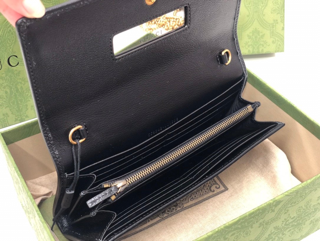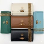 Elevate your evening and everyday ensembles with the exquisitely crafted Gucci Leather Chain Wallet. This elegant piece beautifully marries function with high-fashion design, perfectly highlighting the House’s flexible and innovative use of luxurious materials.