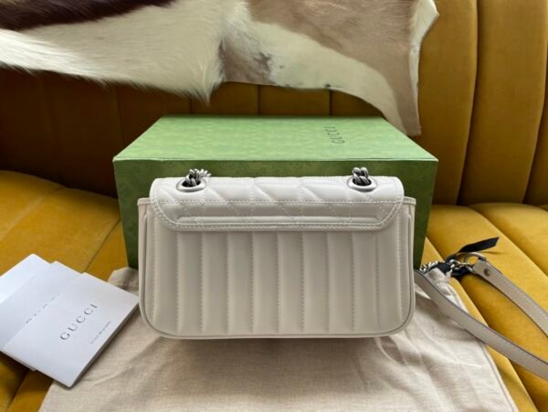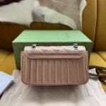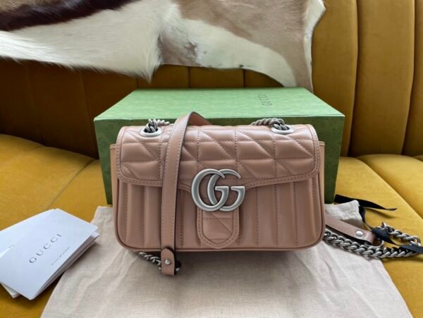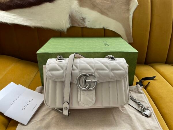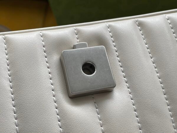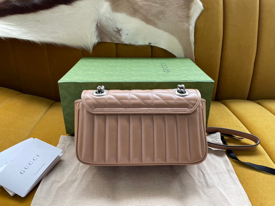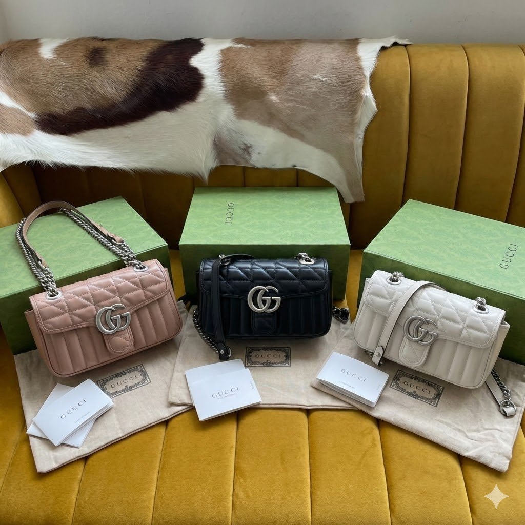 The GG Marmont series is widely revered for its signature quilted leather and iconic Double G monogram hardware. This specific Aria edition elevates that legacy by brilliantly fusing two distinct stitched patterns into one seamless design: a dynamic diagonal (chevron) motif, perfectly complemented by sleek vertical stripes. Crafted from premium leather, the bag offers an incredibly luxurious tactile feel and a beautifully structured shape.