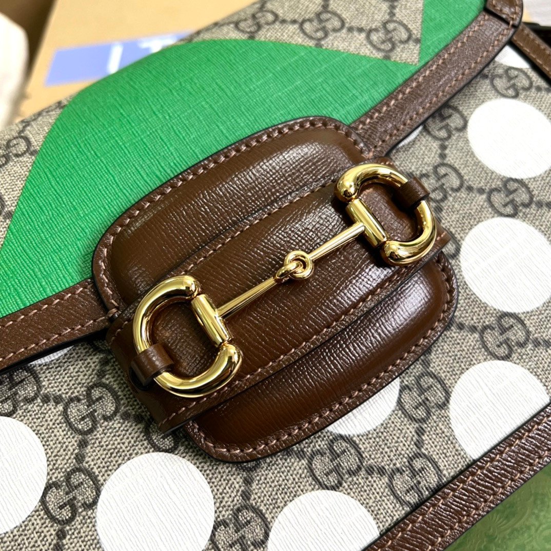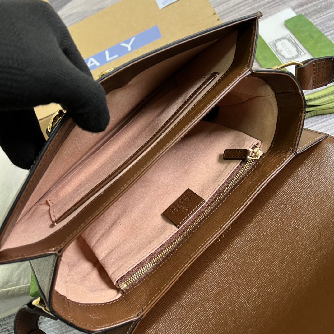 The entire structured silhouette is beautifully framed by rich brown leather trim and anchored by the historic gold-toned Horsebit hardware on the front flap closure.
