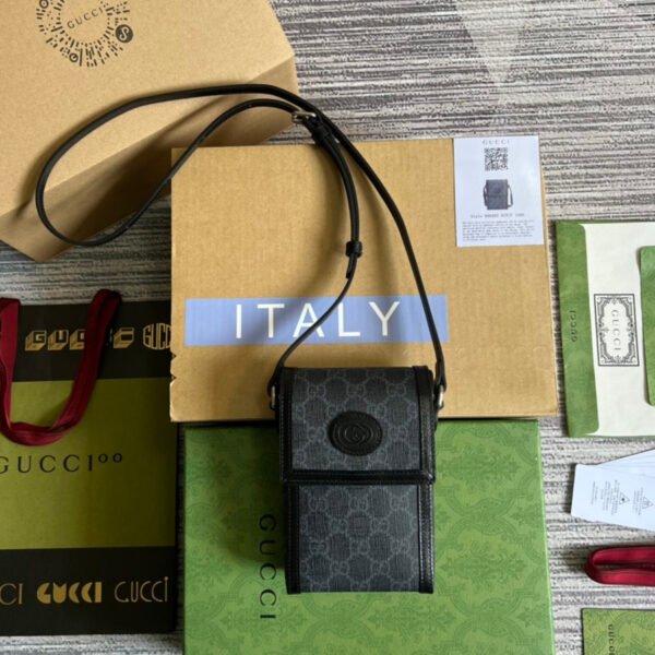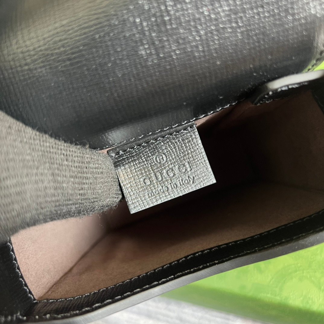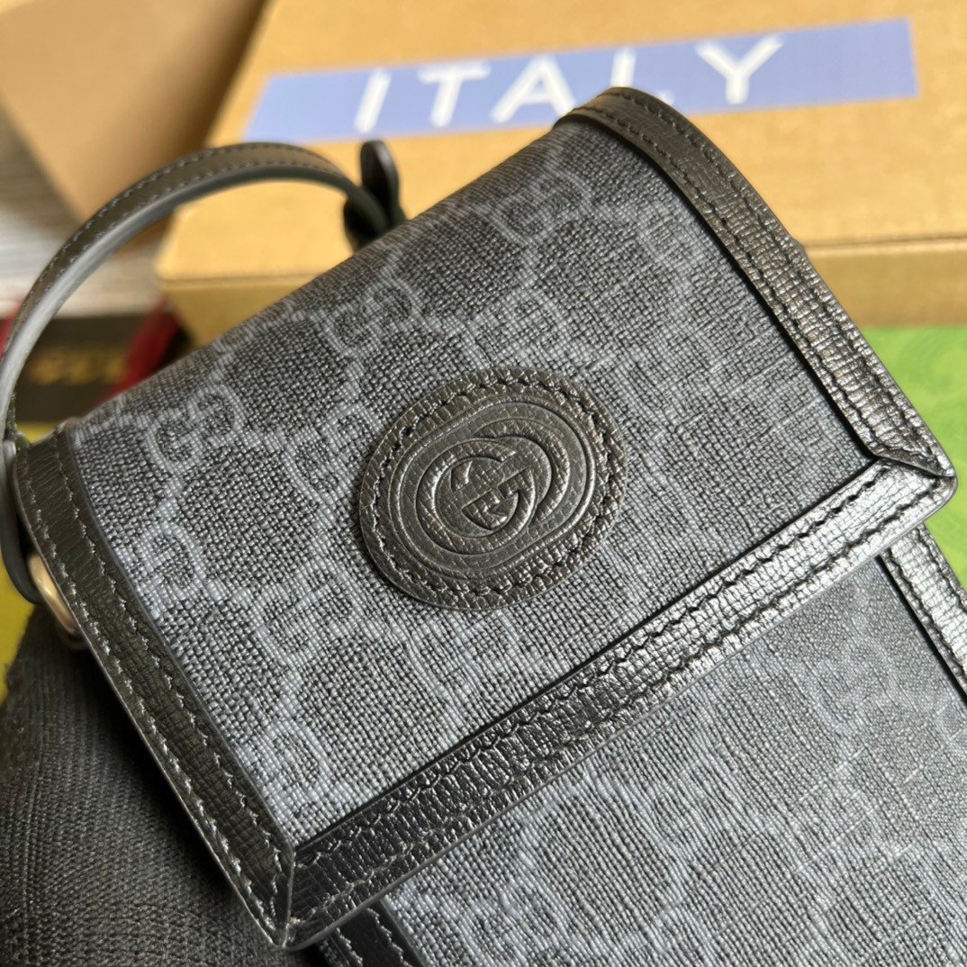 Chic Design & Details The dark, sophisticated black and grey GG canvas is beautifully framed by smooth black leather trim. The front is adorned with a distinctive black leather oval patch featuring an embossed Interlocking G logo, adding a subtle yet unmistakable touch of brand heritage.