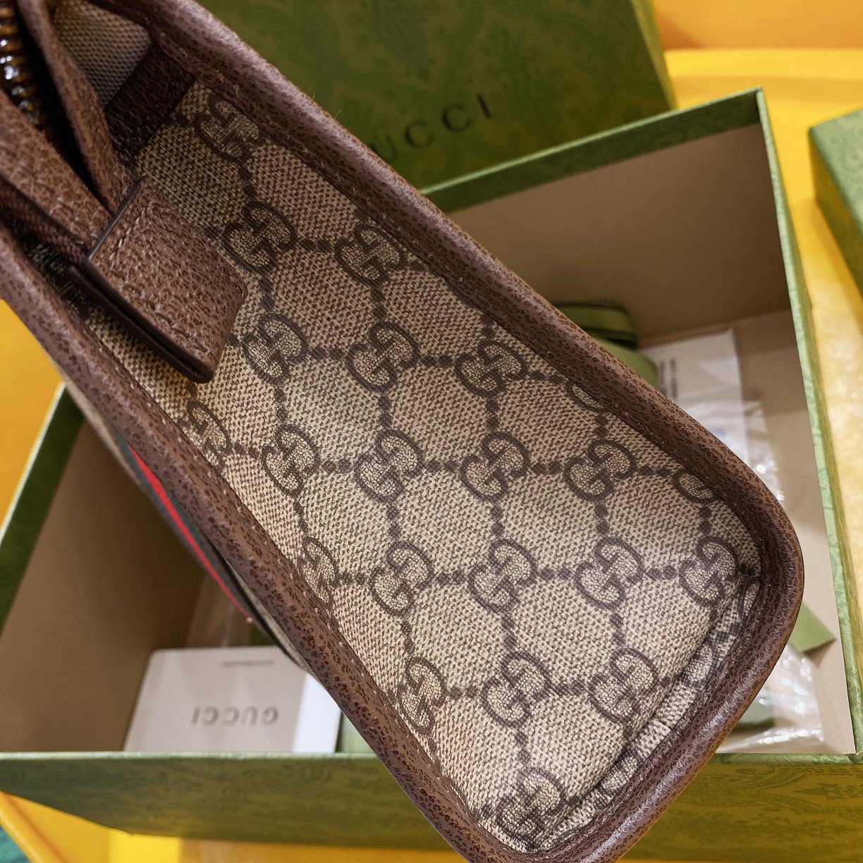 Iconic Materials & Heritage Design This piece is expertly crafted using the House’s highly recognizable GG Supreme canvas, which is beautifully framed by premium cowhide leather trim in a rich brown hue. The front face is proudly bisected by the signature Green and Red Web stripe, paying direct homage to Gucci’s equestrian roots. Anchoring this classic design is the iconic Double G emblem, crafted from elegant antique bronze hardware that perfectly enhances the retro aesthetic.