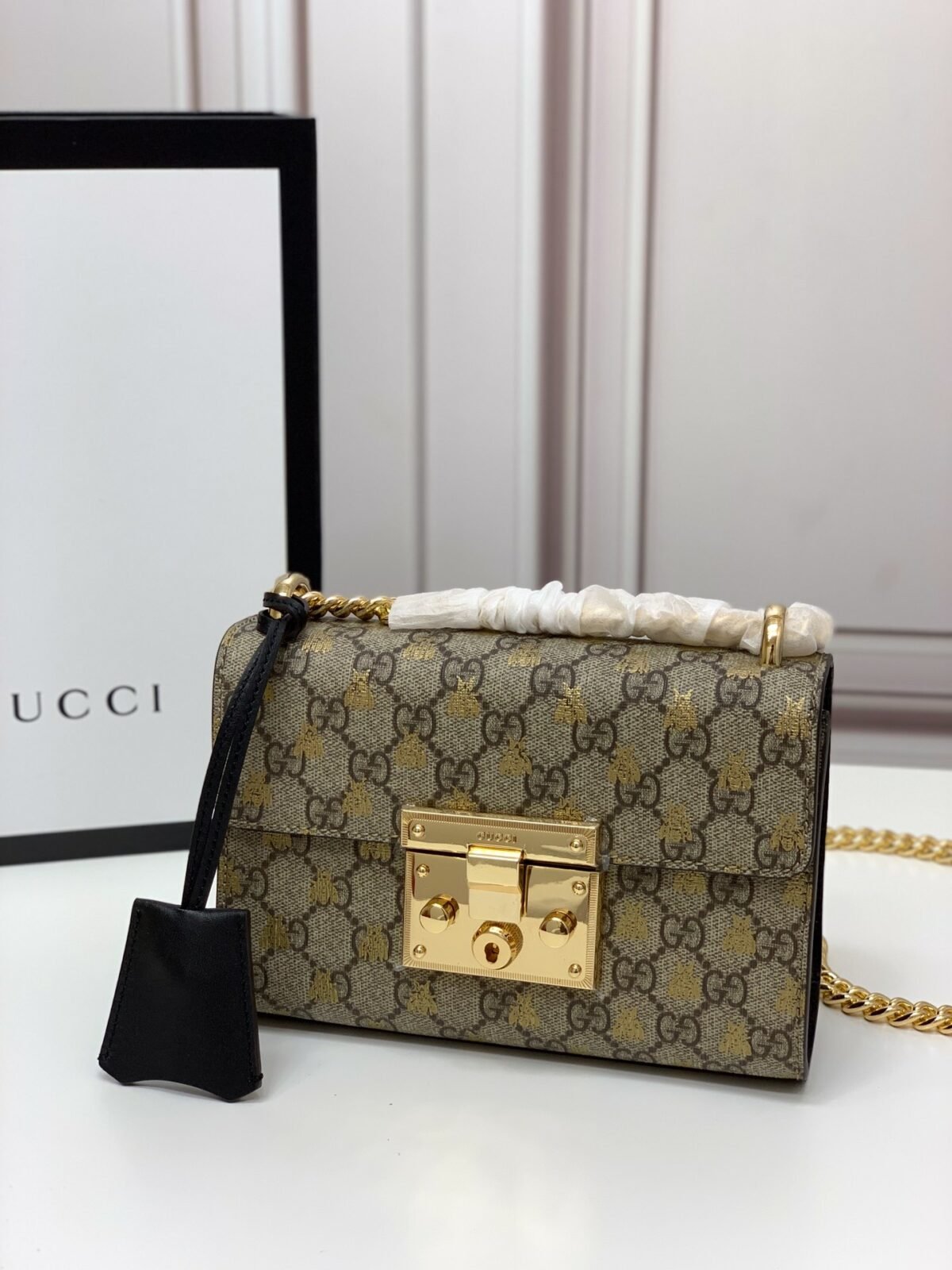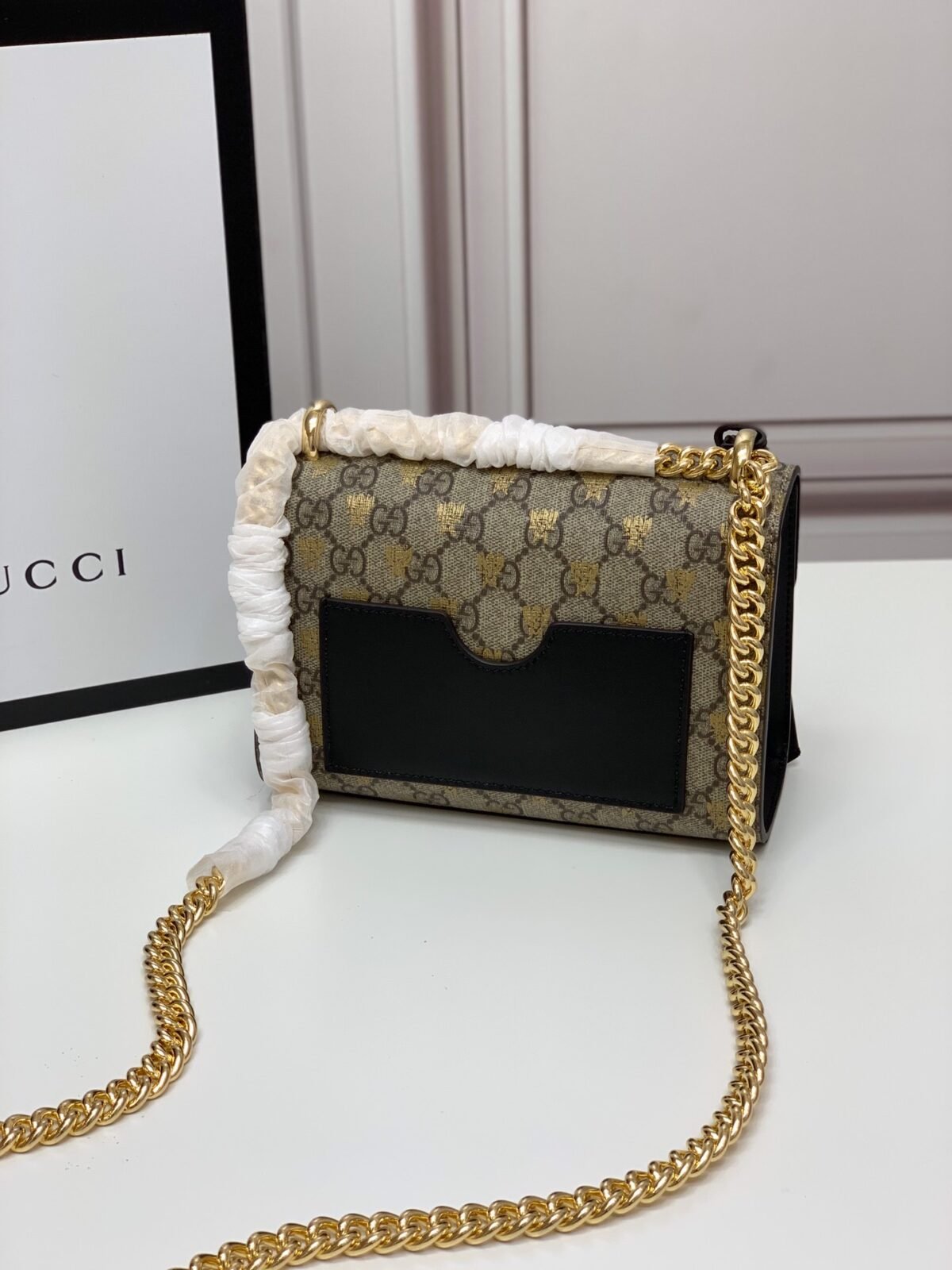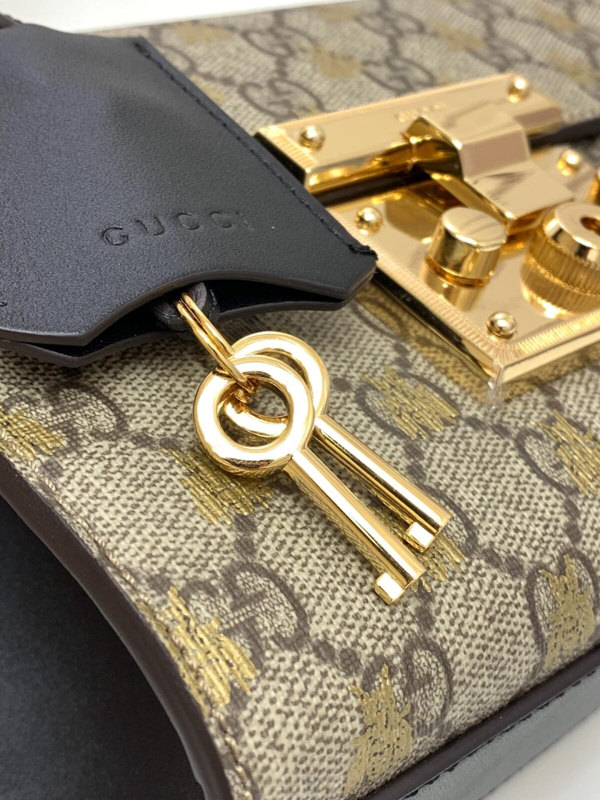 Metallic Bee Canvas: A mesmerizing take on the historic GG Supreme canvas, overlaid with a striking metallic gold foil bee print that catches the light beautifully.