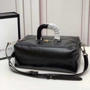 Premium Vintage Finish Crafted from exceptionally soft, textured cowhide leather, the bag offers a luxurious feel. The black leather undergoes a specialized treatment process to achieve a slightly rubbed, distressed finish, giving the glossy exterior a beautifully authentic vintage appearance. The design is elegantly anchored by a subtle, two-tone Interlocking G hardware detail on the front.