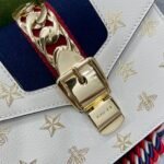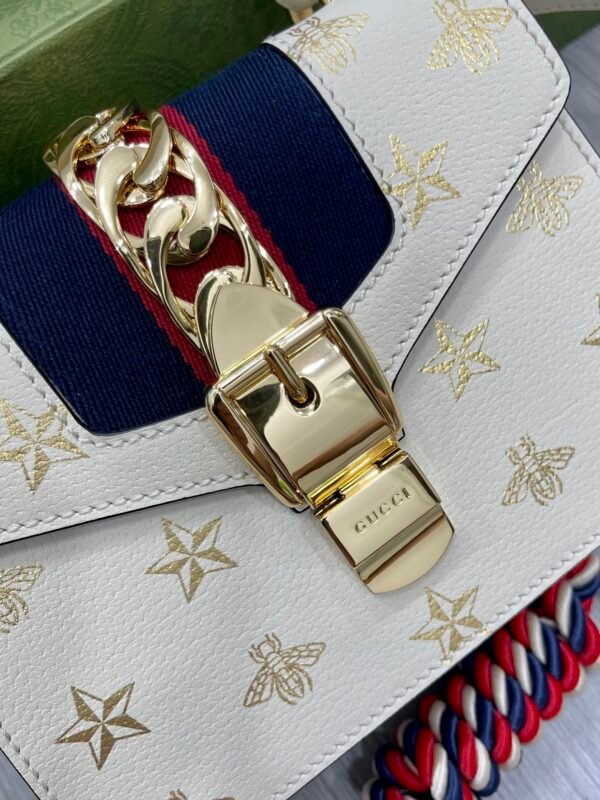 Crafted from pristine white smooth leather, this exquisite piece is brought to life by a striking metallic gold foil print featuring the house’s signature bees and stars—a whimsical combination that is truly mesmerizing. The bag’s focal point is the iconic Sylvie navy and red nylon Web stripe running down the center flap, secured by a heritage-inspired, chunky gold-tone chain and buckle closure.
