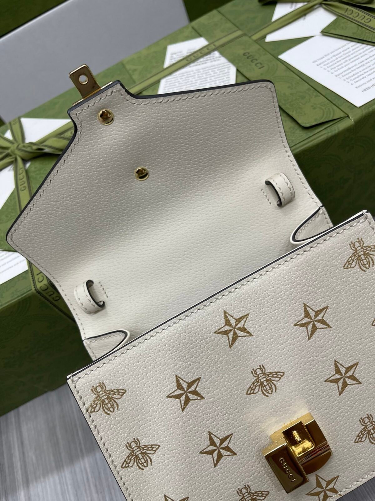 Key Features: Metallic gold bee and star motifs, iconic central Web stripe, elegant top handle, and two removable straps (one classic leather, one playful braided rope) for multiple styling options.