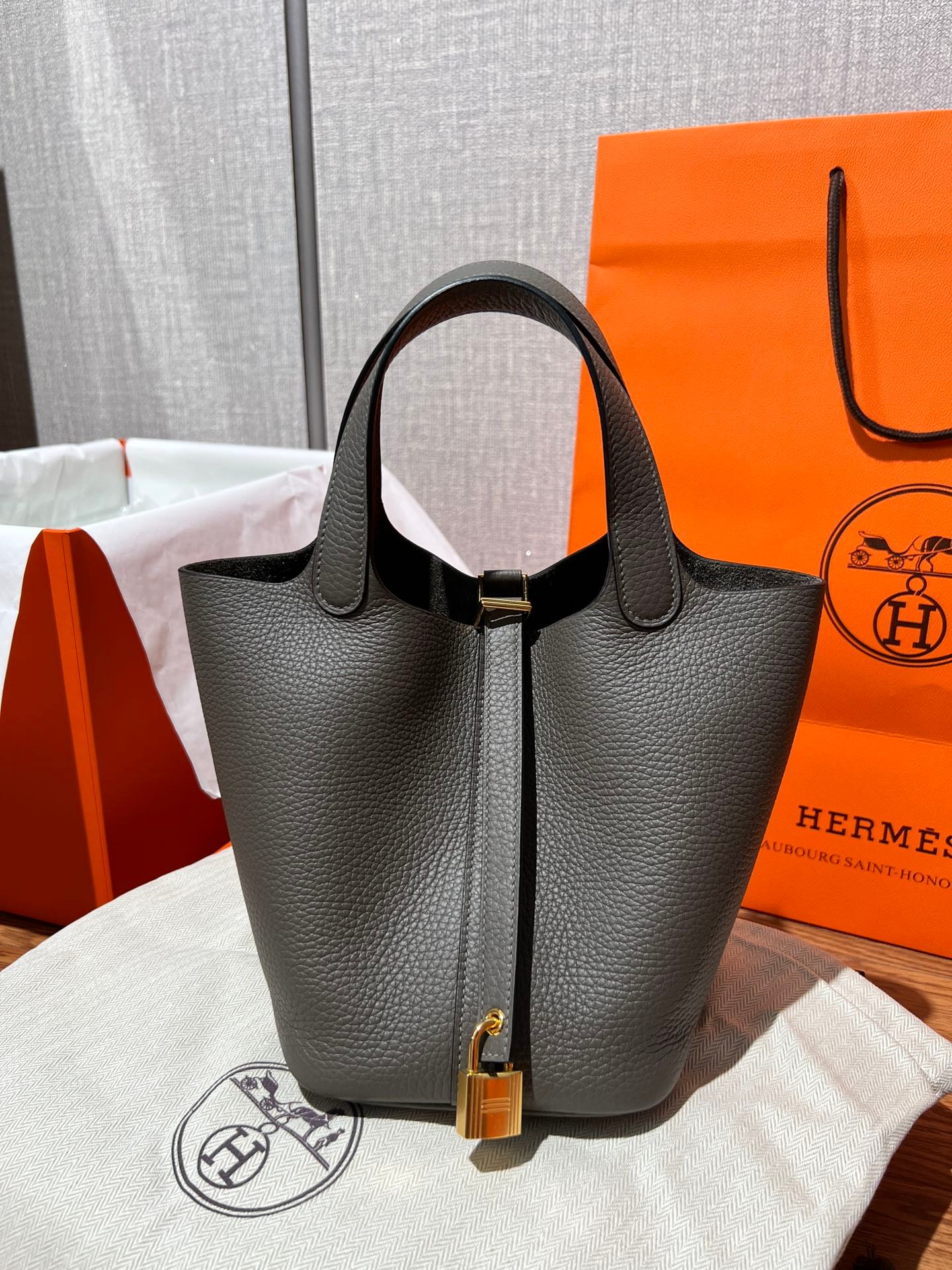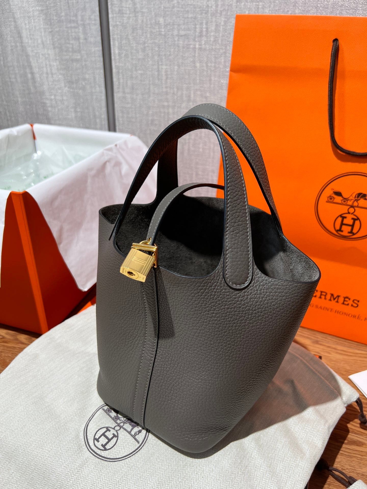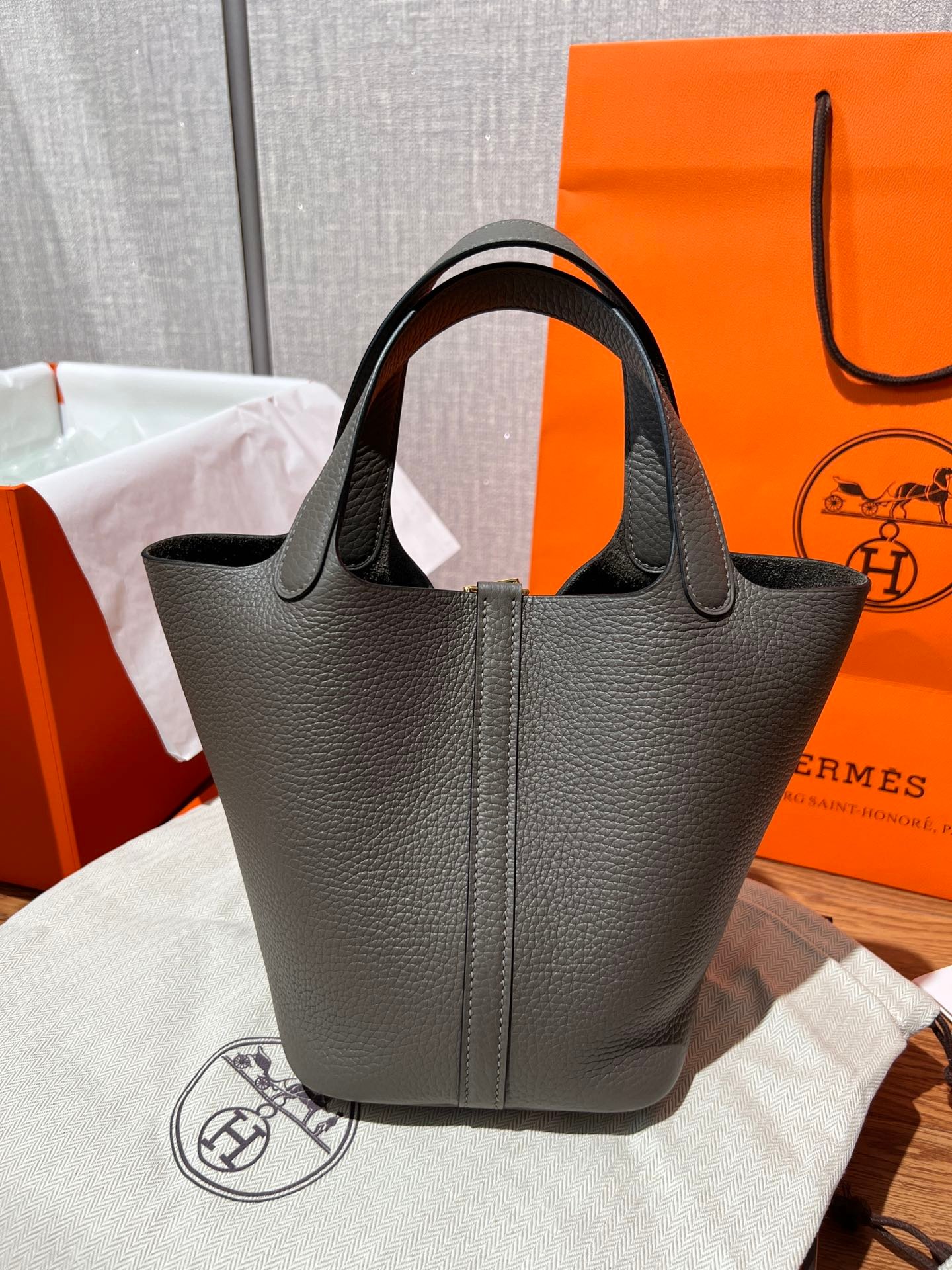 Elephant Gray (Etoupe): The quintessential classic. This iconic shade features beautiful contrast stitching that highlights the bag’s artisanal construction.
