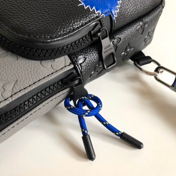 Premium Italian Craftsmanship & Dynamic Design Crafted from premium Italian-grade materials, the bag showcases the Maison’s signature Damier Infini leather. The upper body is rendered in a sophisticated slate grey with a deeply embossed Monogram pattern, while the front pocket features a striking “V” motif in vibrant electric blue. The meticulous white zig-zag silk-screen stitching adds a rugged, artisanal touch that sets this Summer Edition apart from the classics.