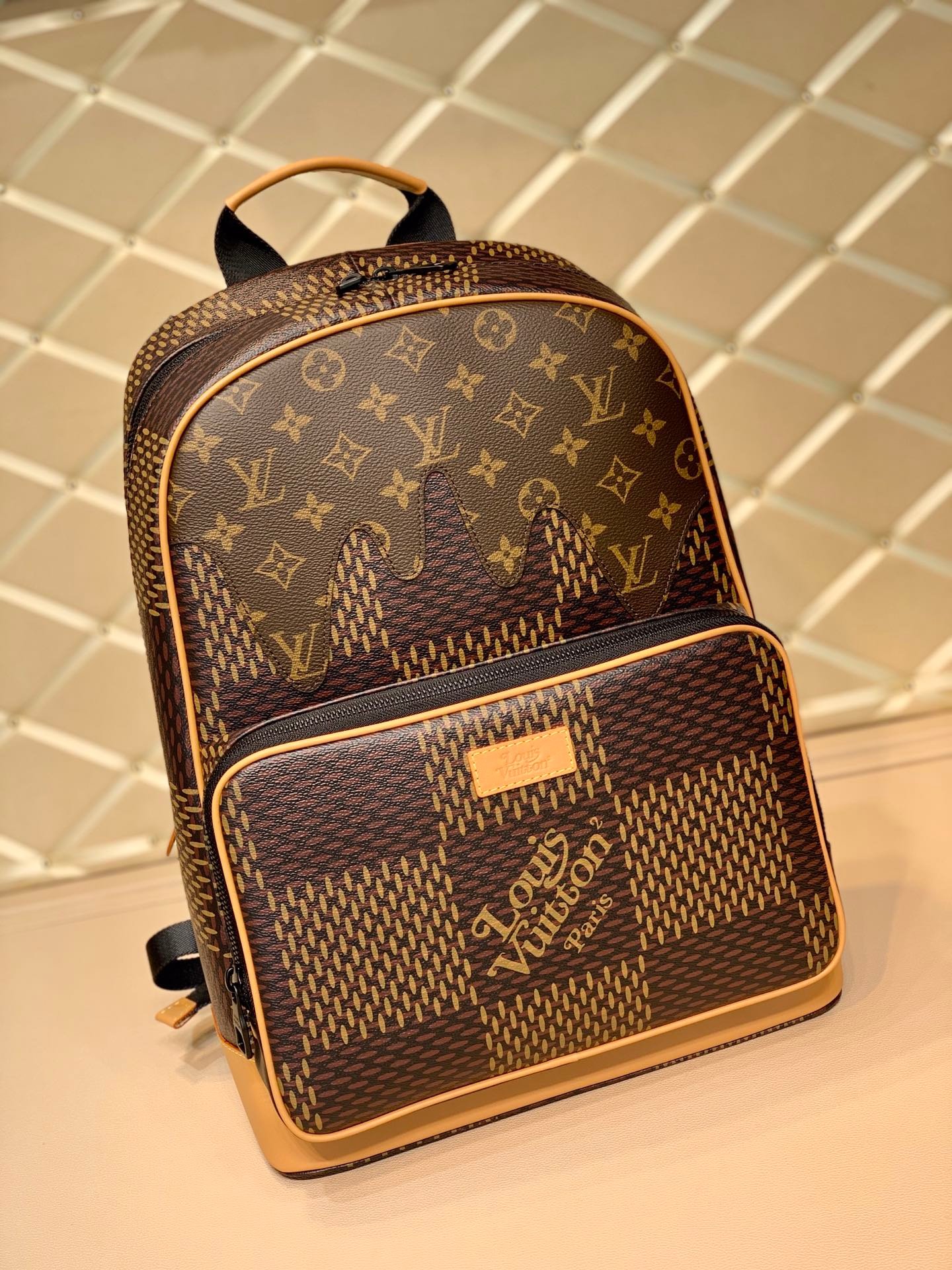 Key Features: Exclusive Nigo “drip” design, Giant Damier pattern, LV² front logo, large front zip compartment, dual interior flat pockets, adjustable leather shoulder straps, and a leather top carry handle.