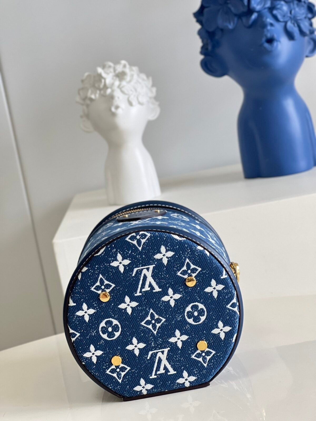 Blue Monogram Denim: A fresh, contemporary take featuring a textured blue denim body woven with white Monogram motifs, beautifully accented with rich navy blue leather trim.
