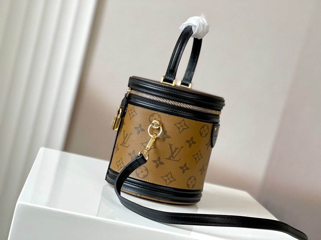 Key Features: Heritage vanity case silhouette, semi-rigid cylindrical structure, wrap-around zip closure, single leather top handle, and a detachable/adjustable leather shoulder strap.